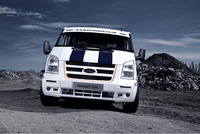 Внешне Ford Transit SuperSportVan обзавелся аэродинамическим обвесом кузова: передним спойлером, накладками на пороги и расширенными колесными арками, в которых красуются белые колесные диски с низкопрофильной резиной 235/45. Кузов спорт-фургона украшают «гоночные» полосы синего цвета.