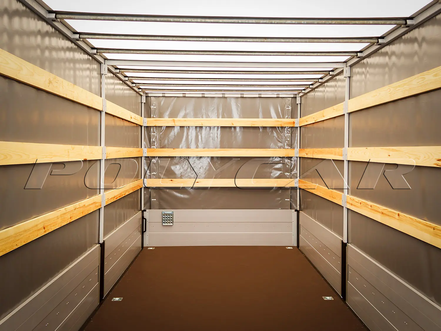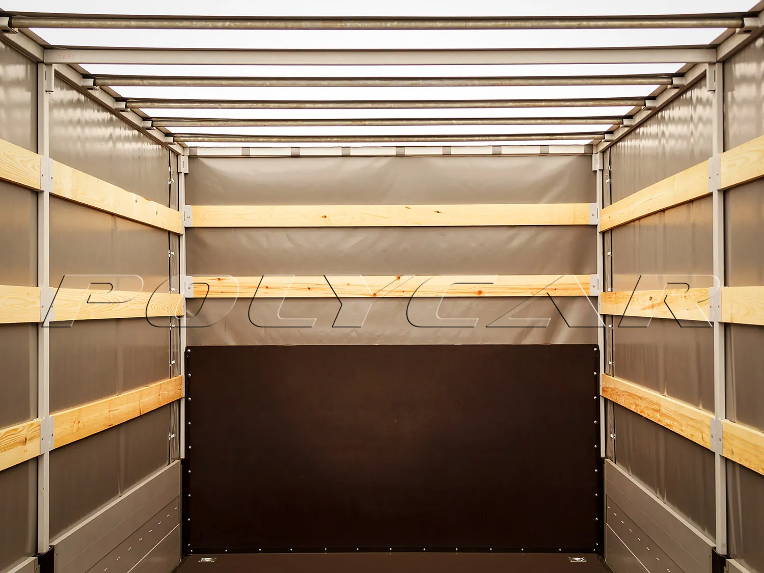 Теперь подробнее о надстройке. Внутренние размеры кузова составляют 7500 х 2450 х 2400 мм (ДхШхВ). Платформа представляет собой сварную монолитную конструкцию из холоднокатанного металлического профиля и обработана двухкомпонентными акриловыми грунтами. Бортовые стенки изготовлены из оригинальных анодированных профилей высотой 600 мм, а соединены профили с помощью пазов. Также в конструкции предусмотрена передняя защитная стенка кабины высотой 1250 мм.