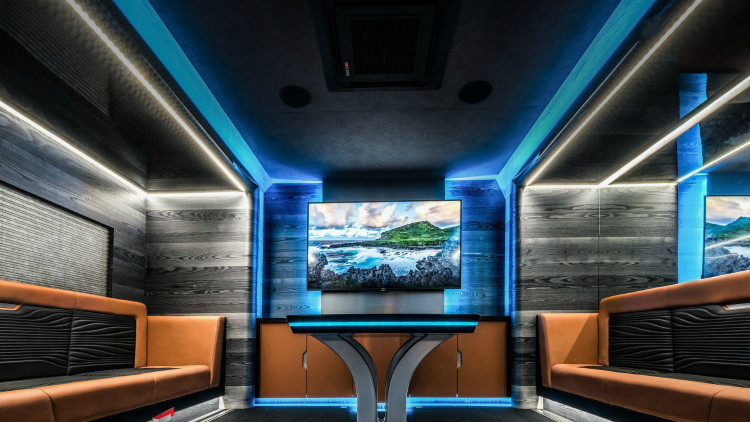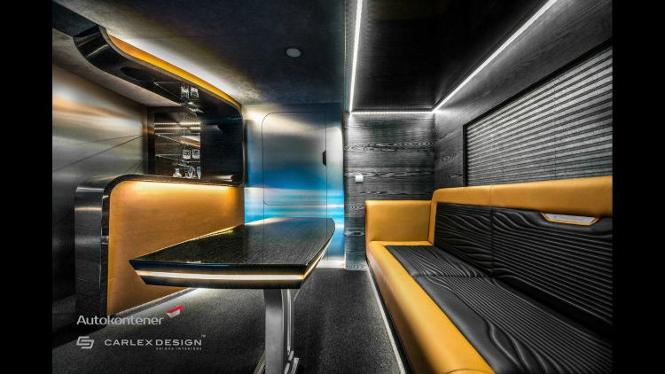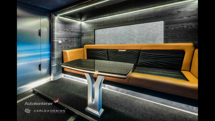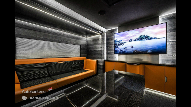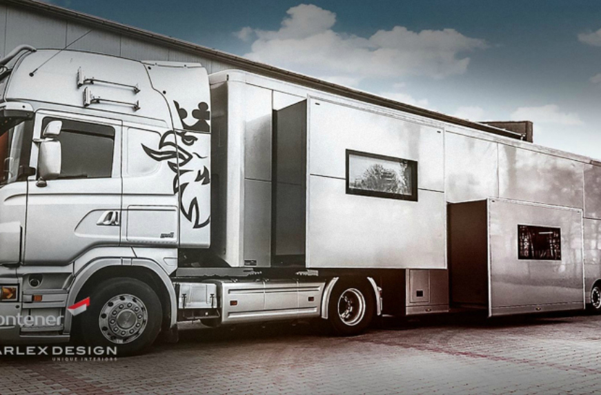 Cамая свежая разработка Сarlex Design касается целого автопоезда, а точнее полуприцепа, который специалисты превратили в настоящий дворец на колесах. Такие отели подошли бы не только для частных автопутешествий, но и, например, для спортивных команд, таких как Формула 1, которые активно используют в своих переездах специальные автопоезда.