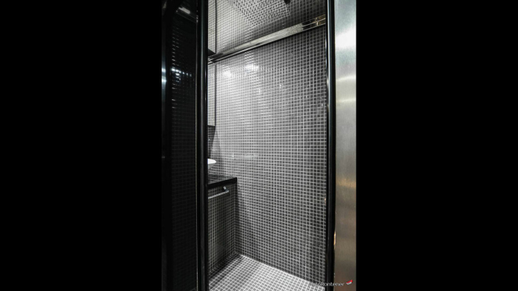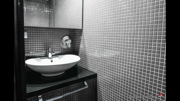 В данном случае обитатели автодома от Сarlex Design могут насладиться роскошью дорогих материалов: натуральной кожей диванов, полированным алюминием стен или натуральной мозаичной плиткой полноразмерной ванны.