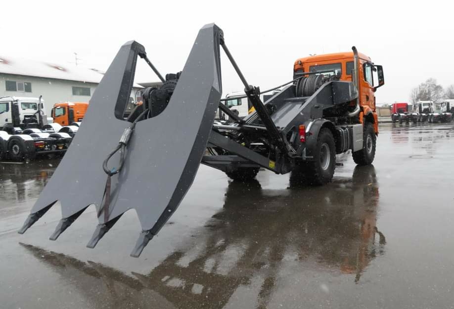 На подготовленном для внедорожной эксплуатации полноприводном шасси модели MAN TGS 18.510 4х4 был установлен мощный отвал, приводимый в действие гидравликой. За ним смонтирована гигантская лебедка со сверхпрочным тросом. Данное оборудование установила еще одна немецкая компания – Frank Fockersperger, коньком которой является постройка землеройной техники.