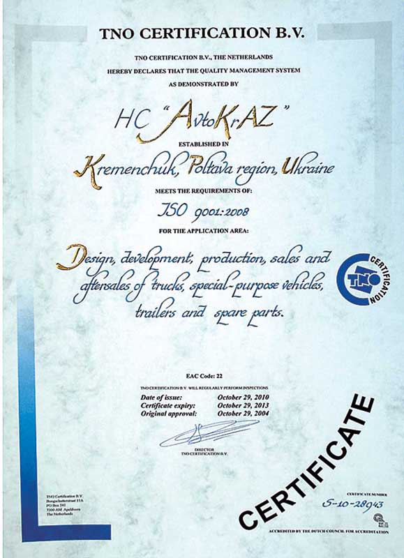 8 ноября стала обладателем сертификата на соответствие стандартам качества ISO 9001 2008. Сертификат был выдан на основании положительных результатов ресертификационной аудиторской проверки системы управления качеством Холдинговой Компании «АвтоКрАЗ», которая проводилась ведущими международными экспертами–аудиторами – компанией «Citech Ukraine B.V», официальным представителем нидерландской организации TNO Certification B.V. в Украине. Напомним, что система управления качеством ХК «АвтоКрАЗ» была сертифицирована на соответствие требованиям стандарта ISO 9001:2000 еще в 2004 году. А в 2008-м Международной организацией по стандартизации (ІSО) утверждена четвертая редакция стандарта ISO 9001 – версия 2008 года.