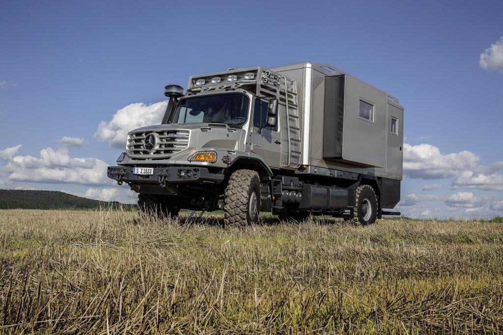 Полноприводный грузовик Mercedes-Benz Zetros является «старшим братом» многофункциональной модели Unimog. Для постройки кемпера выбрали двухосную модель Zetros 1833 – полной массой 18 т и турбодизелем в 7,2 л и мощностью 326 л. с. Автомобиль показывает чудеса проходимости. Этому способствуют постоянный полный привод, три блокируемых дифференциала, двухступенчатая «раздатка». Машина может преодолевать брод глубиной 1190 мм и подъем крутизной 80 процентов. Автомобиль обут во внедорожные 20-дюймовые шины размером 16.00 R20.