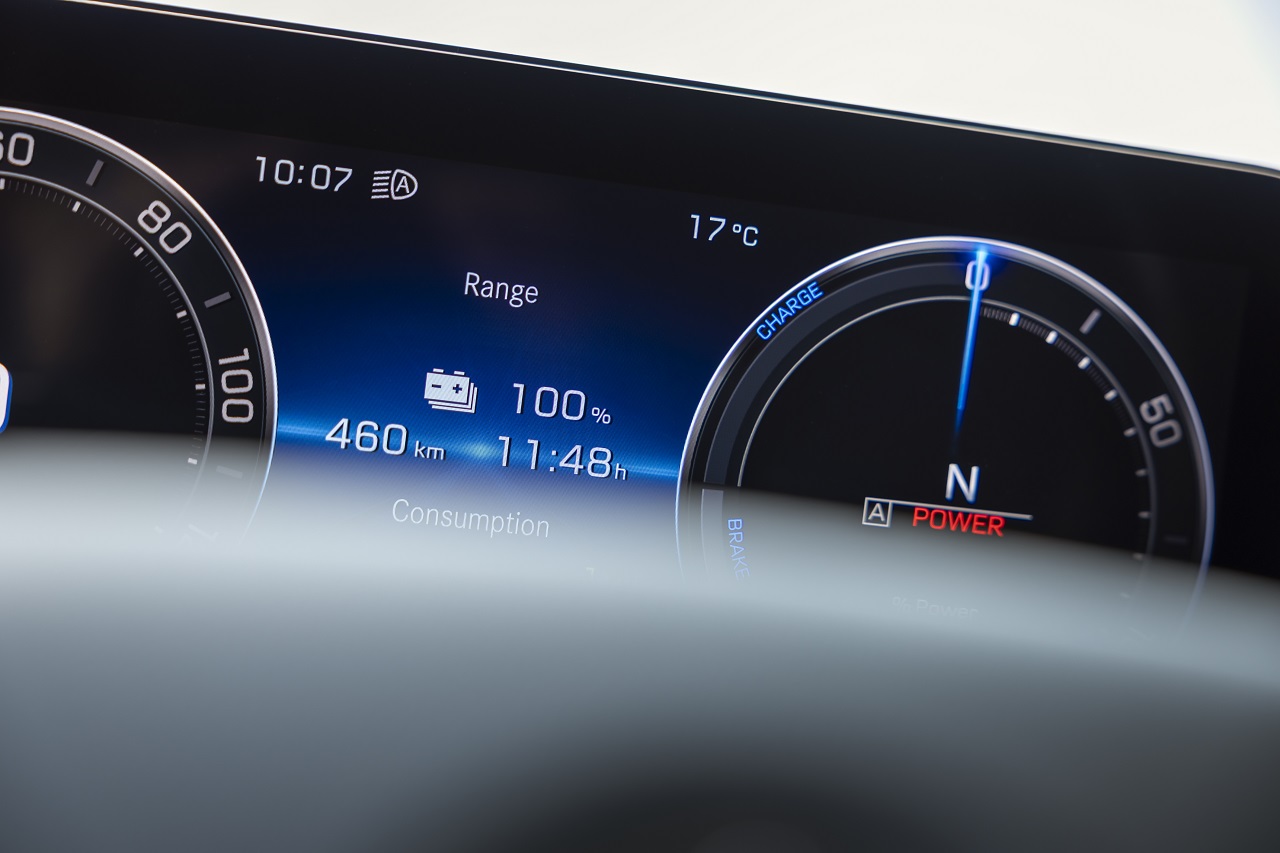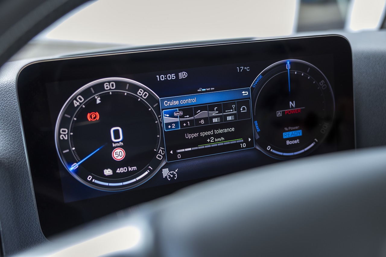 Увеличить запас хода помогает торможение в режиме рекуперации – здесь водитель может выбрать один из пяти режимов, отличающихся интенсивностью замедления. Также можно выбрать функцию управления одной педалью. Сэкономить электроэнергию можно и с помощью предикативного круиз-контроля (PPC), который подстраивает работу трансмиссии под топографию местности, учитывая дорожные знаки. Более того, для более эффективной работы PPC теперь руководствуется еще и данными с навигационной системы.
