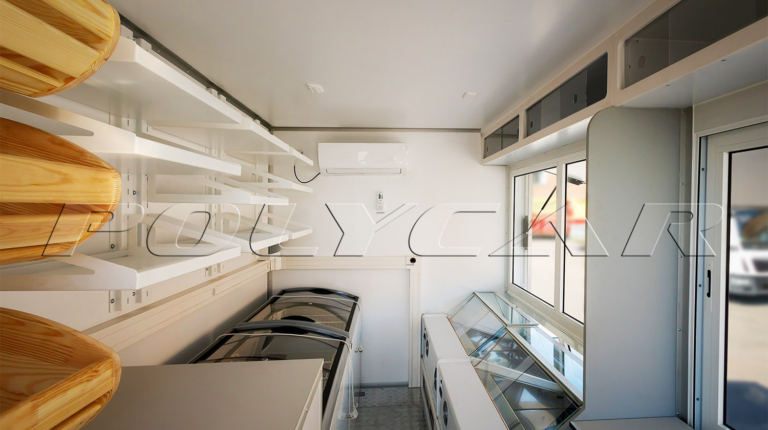 Был установлен кузов-фургон бескаркасной сэндвич-панельной конструкции. Снаружи и внутри применена обшивка из армированного стекловолокном пластика. Передняя панель приспособлена для установки кондиционера. Надстройка оснащена стеклопакетами, морозильной камерой, холодильными витринами, а также стеллажами для хлебобулочных изделий. В комплектацию входят дизель-генератор, обогреватель Webasto, кухонная мойка с краном, шкаф для одежды и кассовая зона.