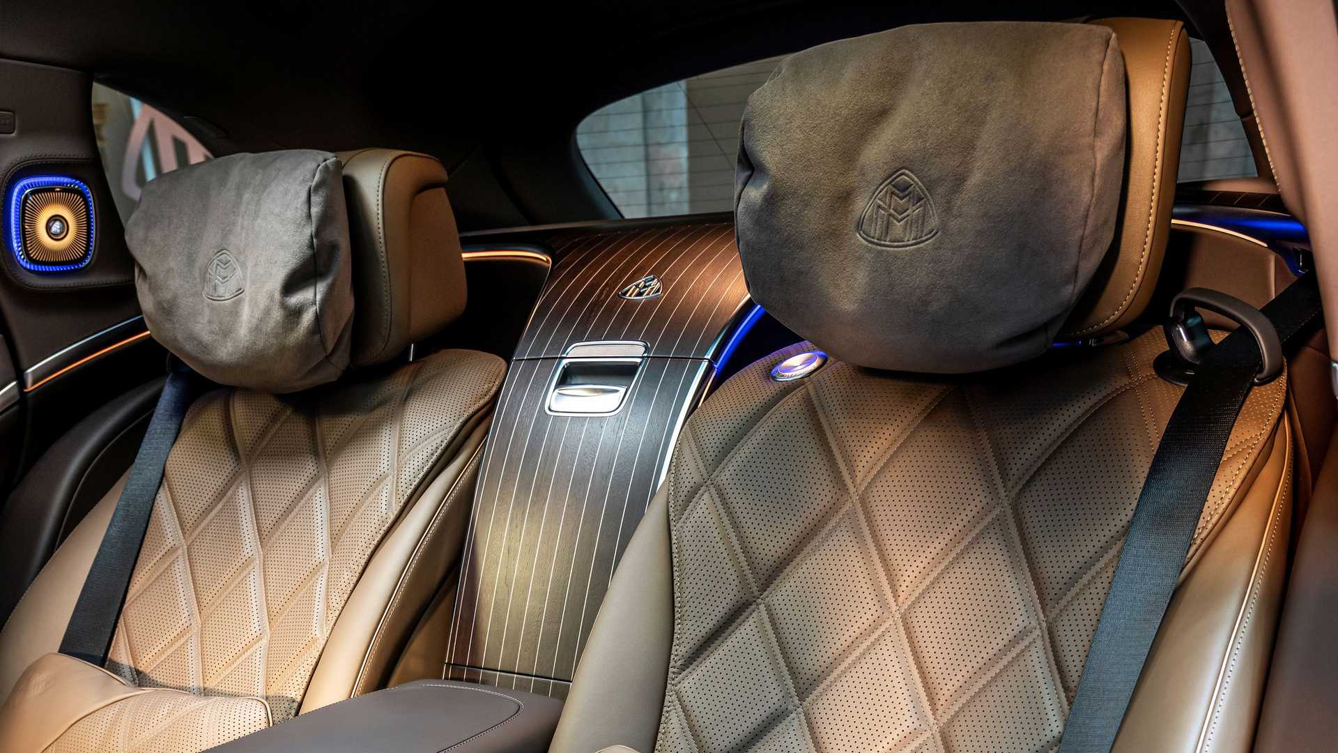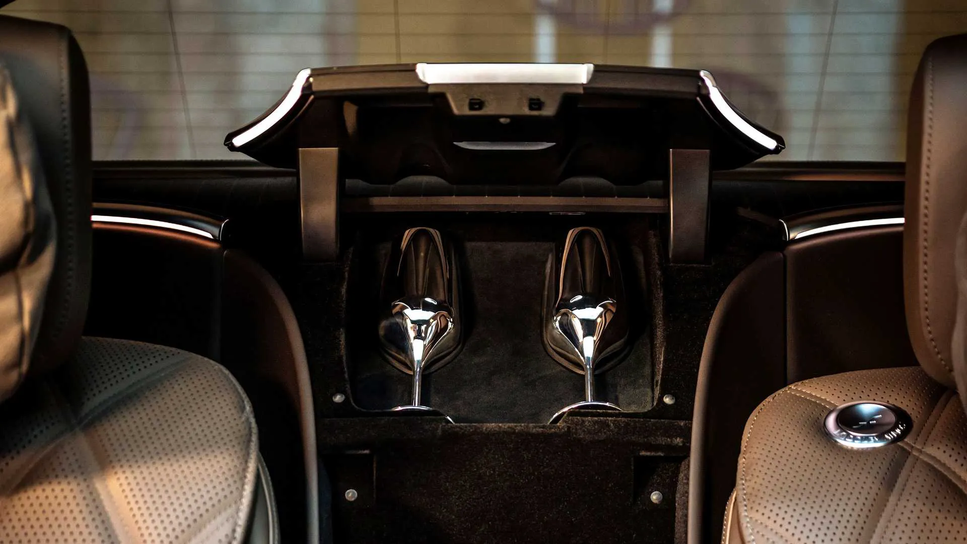 Для пассажиров второго ряда предлагаются дополнительные 11,6-дюймовые экраны, которые закреплены на спинках передних сидений и обеспечивают доступ к мультимедийной системе MBUX, мини-холодильник для бутылок, подстаканники с подогревом, четыре порта USB-C и два HDMI. Также заявлена аудиосистема Burmester с пятнадцатью динамиками.