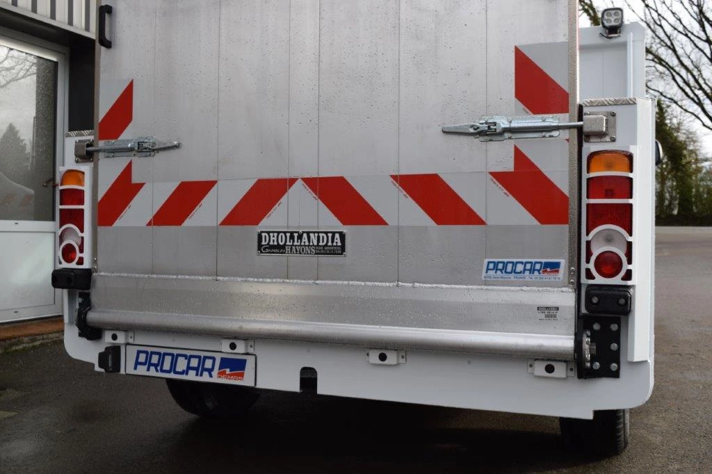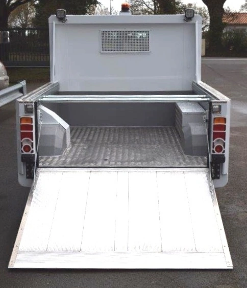 На шасі зі стандартною кабіною було встановлено відкриту вантажну платформу із задньою відкидною рампою. Останню поставив відомий виробник гідробортів – компанія Dhollandia.