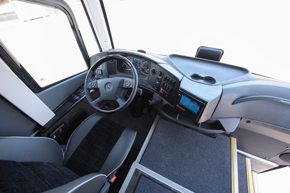 Оттуда же перешло и оформление задней маски кузова – с проштамповками и светоблоками. В отличие от Travego силовой агрегат у новинки из Греции расположен спереди, ведь автобус построен на модернизированном шасси грузовика Mercedes-Benz Atego.