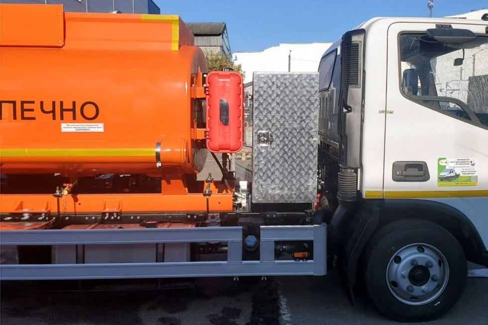 Заслуживает внимание довольно интересная комплектация представленного АТЗ. Так, между кабиной и цистерной был установлен довольно вместительный металлический отсек, оборудованный запираемыми дверцами с обоих бортов. Он предназначен для перевозки инструмента, различных аксессуаров и личных вещей водителя.