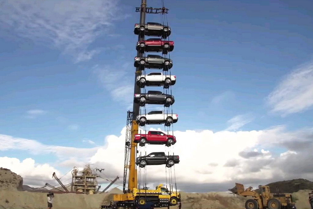 Автопроизводители в рекламной компании своих новинок прибегают к различным спецэффектам. Хотя многие их них уже изрядно приелись. Однако компания Ford решила немножко добавить огоньку. Для показа уникальной прочности рамы новейшего пикапа Ford F-150 модельного года 2017 она использовало нетипичное решение – подъемный автокран. Многие скажут: ну и что – подвесили машину за шкирки. Да подвесили, но не просто. Сначала на крюке автокрана закрепили голую раму пикапа. А затем начали последовательно подвешивать к ней полностью укомплектованные автомобили Ford F-150. И таких набралось восемь штук. Более того, в довесок ко всей этой «колбасе» добавили небольшой самосвал Ford-F750. В итоге, суммарная нагрузка на голую раму пикапа превысила 60 000 фунтов или 30 тонн. Лонжероны выдержали.