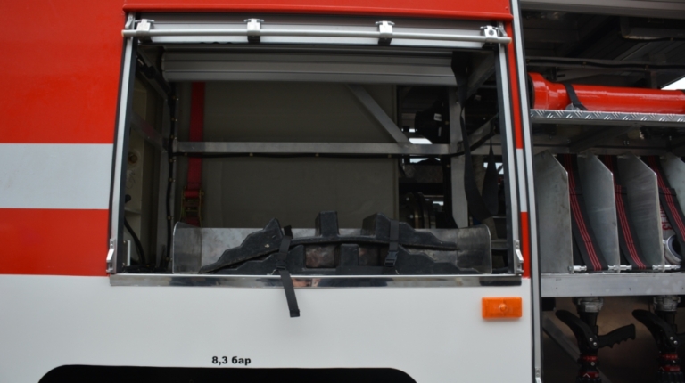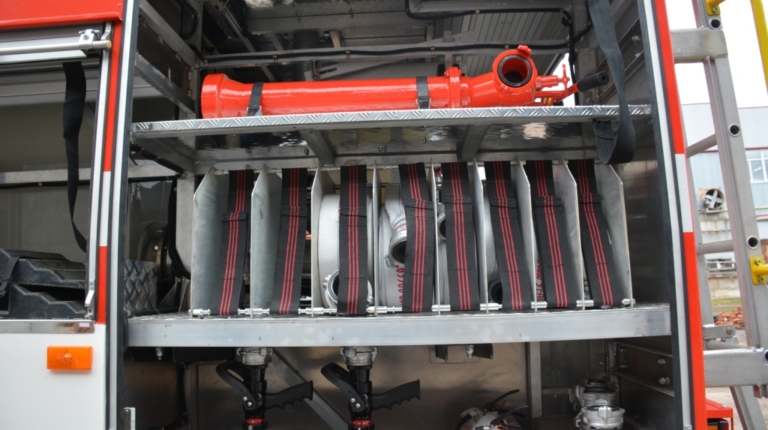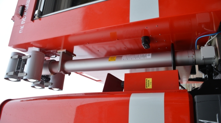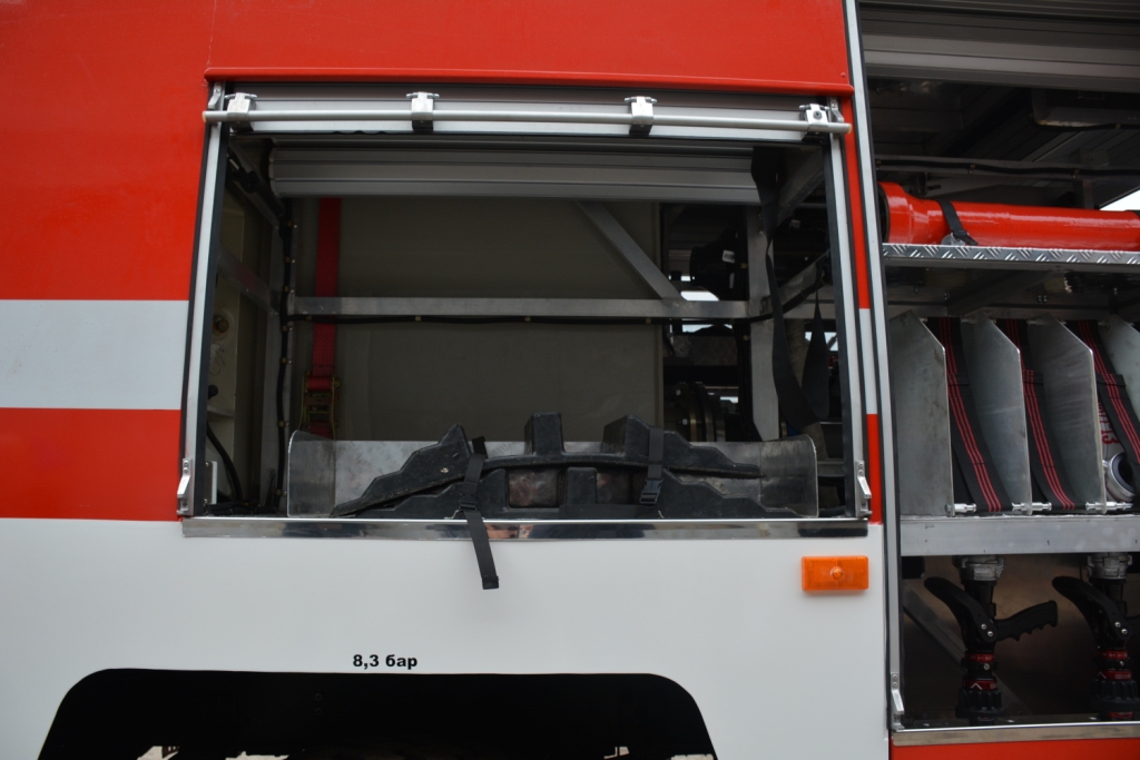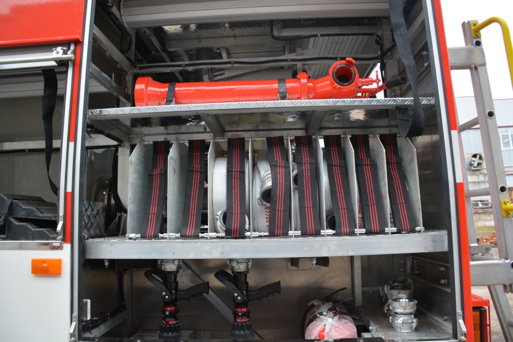 Остановимся подробнее на оснащении для борьбы с огнем. Запас воды составляет 4000 л, для пенообразователя – 400 л. Запас напорных рукавов – 20 штук/общей длиной 400 м. В комплектацию входят один лафетный ствол Protek Style 622 с ручным управлением и 5 ручных стволов.