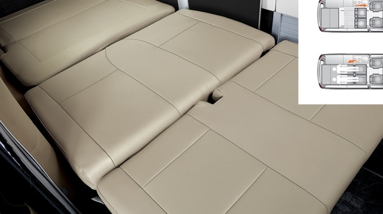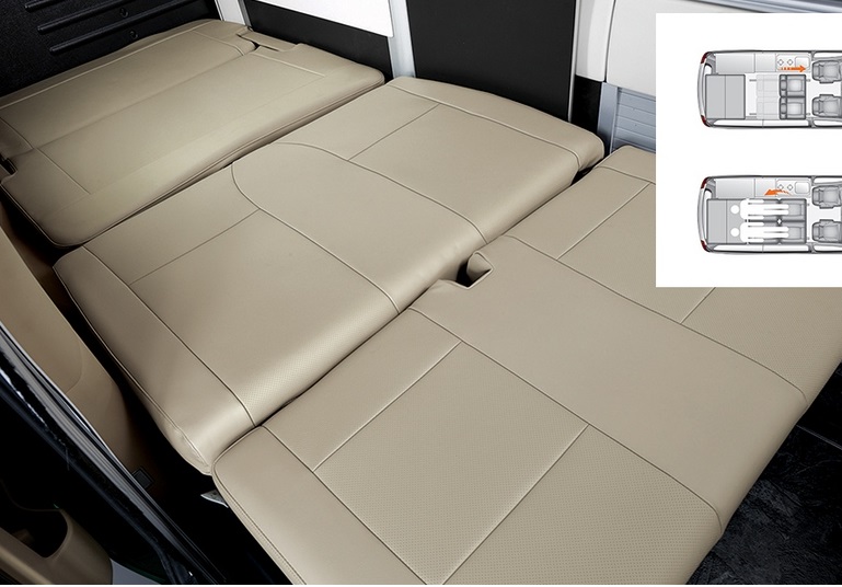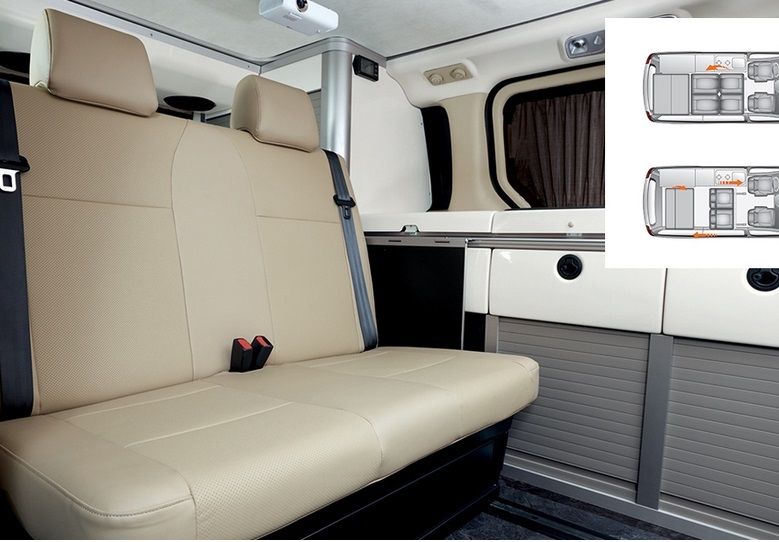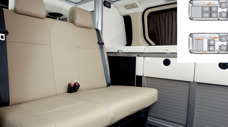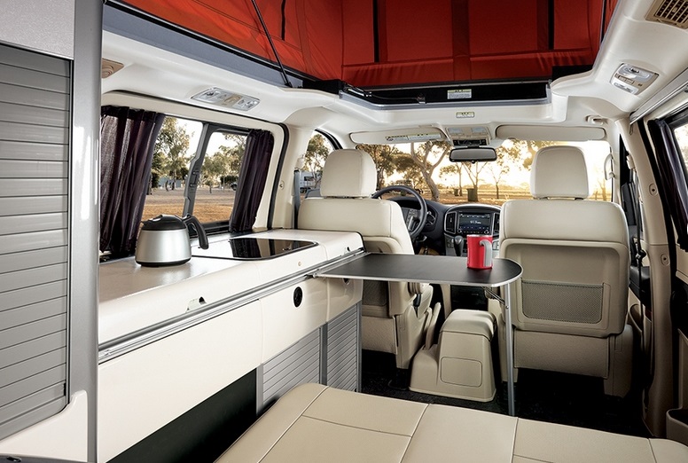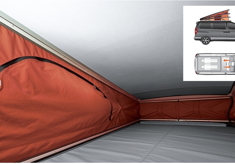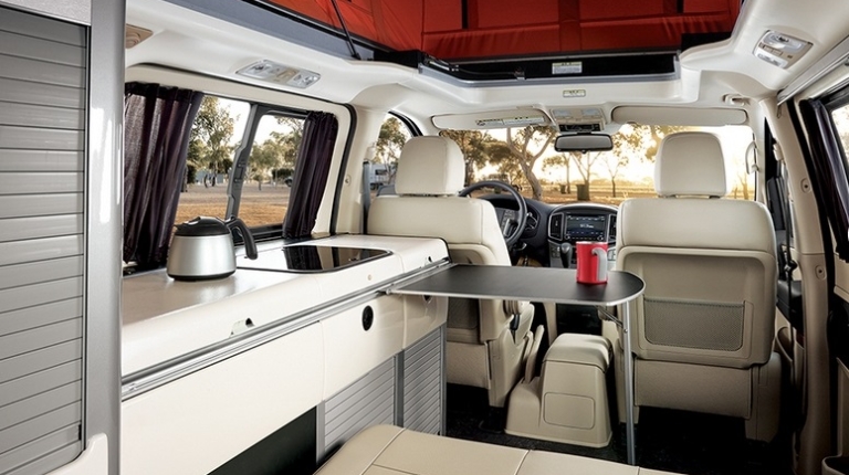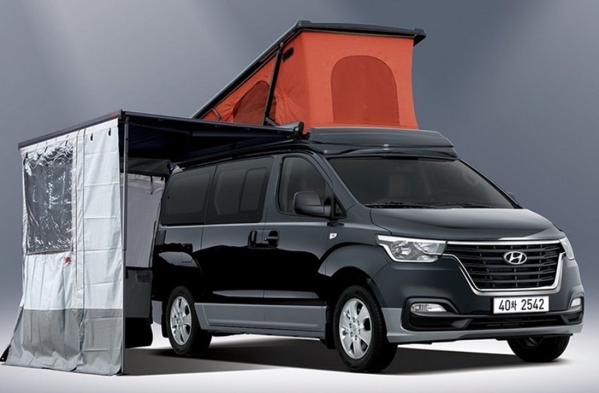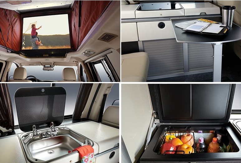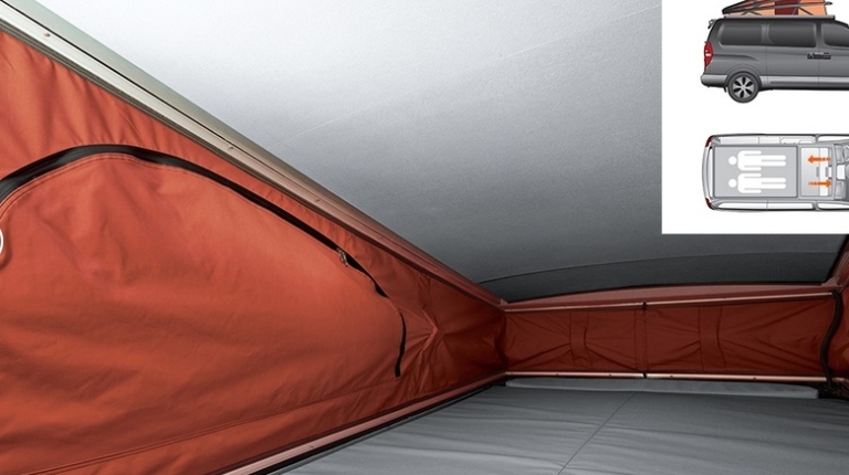 Hyundai Grand Starex получил раздвижную палатку на крыше, в которой установлено двуспальное место. Еще одну двуспальную кровать можно получить из сидений второго и третьего рядом в основном салоне.