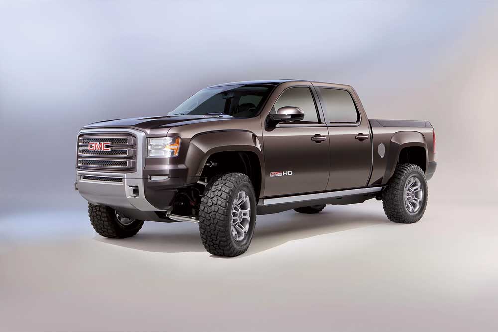 На прошедшем в середине января Детройском автосалоне был представлен яркий пикап-концепт GMC Sierra All Terrain HD. Машина изготовлена на базе серийной модели GMC Sierra 2011 года. Снаружи автомобиль привлекает внимание иной широкой решеткой радиатора, интегрированной в передний бампер с четко выраженным поддоном. Вся наружная светотехника, включая «противотуманки», основана на LED-технологии. Благодаря 35-дюймовым колесам и перенастроенной подвеске клиренс возрос на 76 мм – до 536 мм. Более короткие передние и задние свесы увеличили углы въезда и съезда. Пикап оснащен новой турбодизельной «восьмеркой» Duramax – 6,6 л (400 л. с.), выдающей максимальный крутящий момент 1037 Нм при 1600 об/мин. С двигателем агрегатируется 6-ступенчатая автоматическая КП Allison 1000. Суперпикап GMC Sierra All Terrain HD оборудован 5-местной кабиной и имеет грузоподъемность 2,7 т. При этом он может буксировать прицеп полной массой до 6 т.