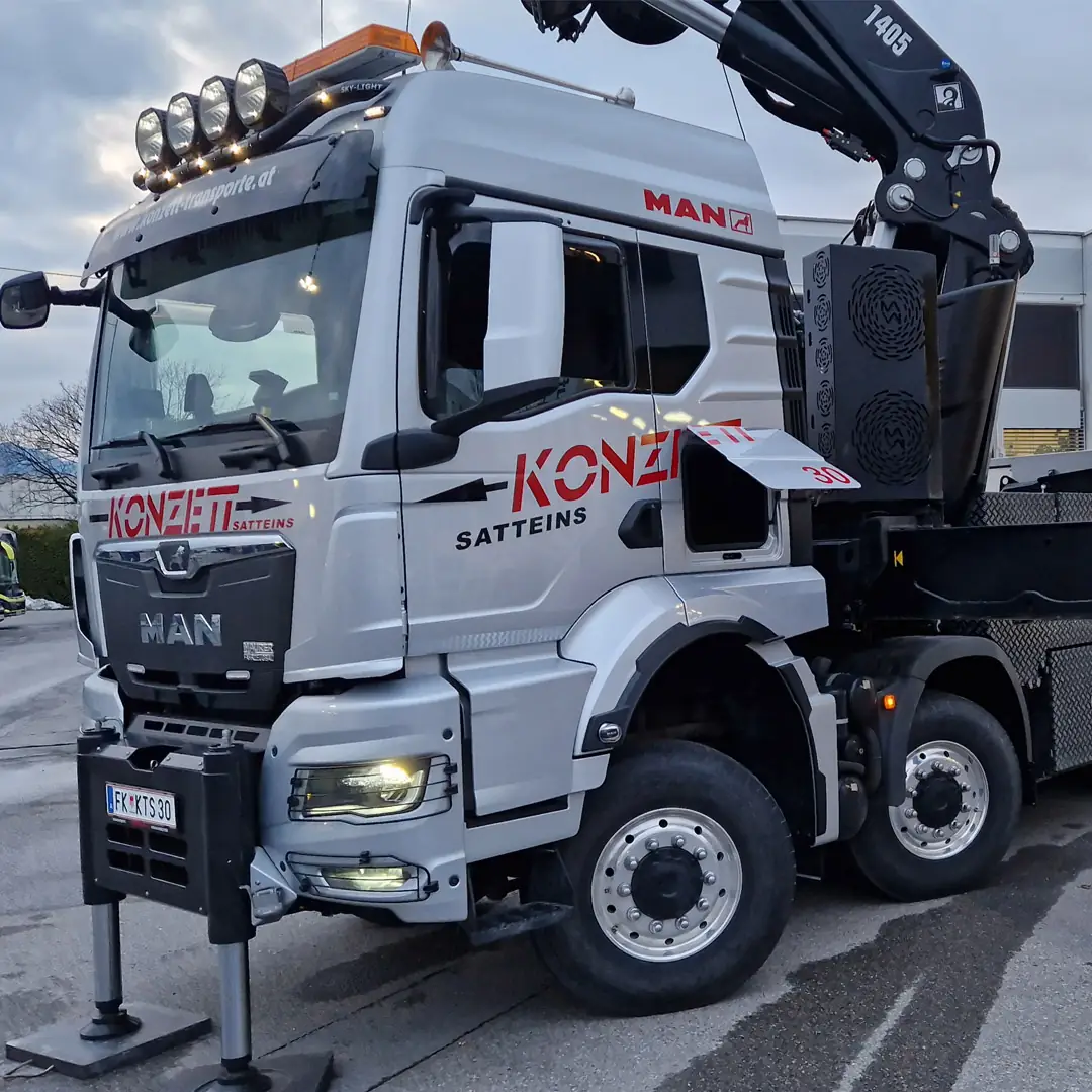 Интересно, что для такого крана-манипулятора шасси оснащается пятью аутригерами – четырьмя по бортам и одним под передним бампером. В данном случае заказчиком выступила немецкая компания Konzett Satteins, в автопарке которой уже работает на одна такая машина.
