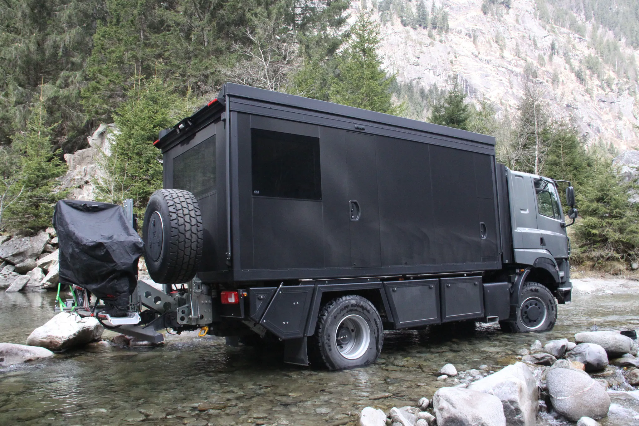 Внутри установлен кухонный блок – с плитой и раковиной, есть баки с водой, холодильник. На раме в задней части смонтировано мощное крепление для перевозки мотоциклов и велосипедов. Кемпер на Tatra Phoenix 4×4 был поставлен немецким дилером – компанией Tschann-Bayern и уже передан заказчику. Автомобиль сфотографирован в живописной долине Альп.