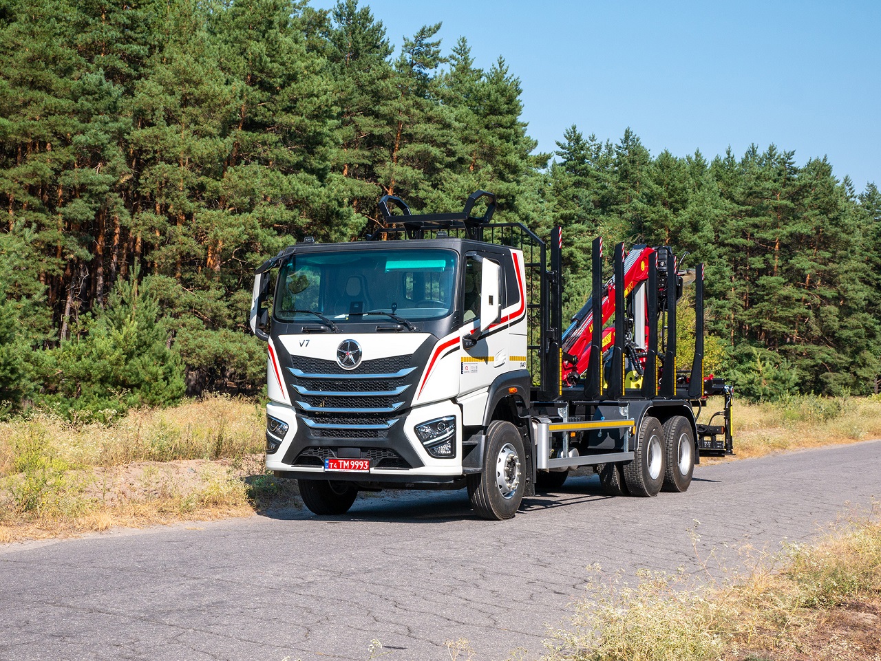Кременчугский завод коммунальной техники «Альфатекс» представляет очередную новинку – лесовоз АТ СB-11 на большегрузном шасси Dayun CGC 1331 (6х4). Если быть точным, то это сортиментовоз, который предназначен для перевозки очищенных от веток стволов деревьев (сортиментов), длиной от 2 до 6 м. Для крепления лесоматериалов на платформе имеется шесть стоек. А за кабиной смонтирована металлическая конструкция, которая защищает от смещения груза.