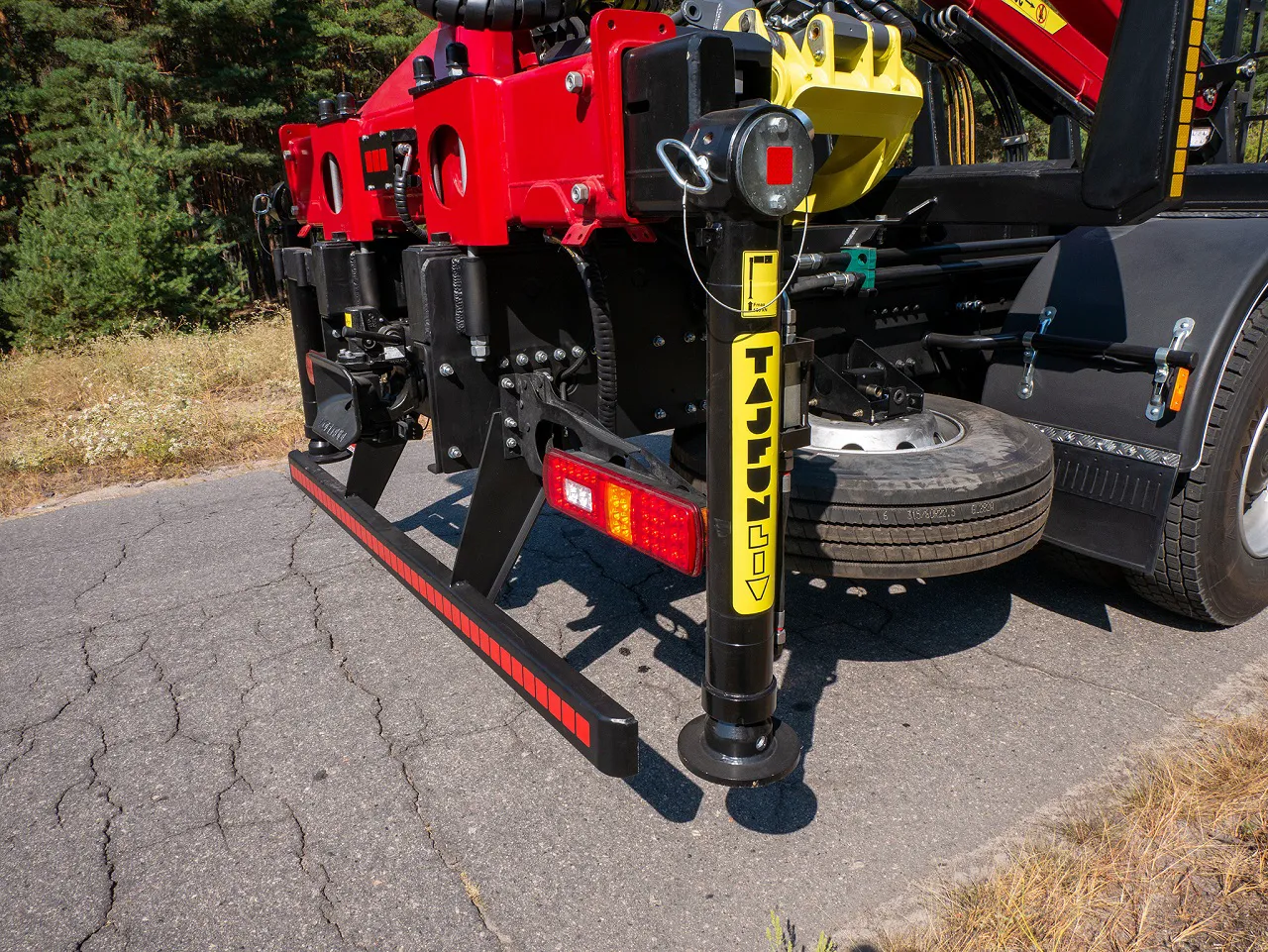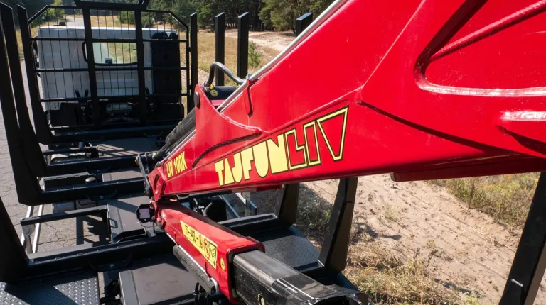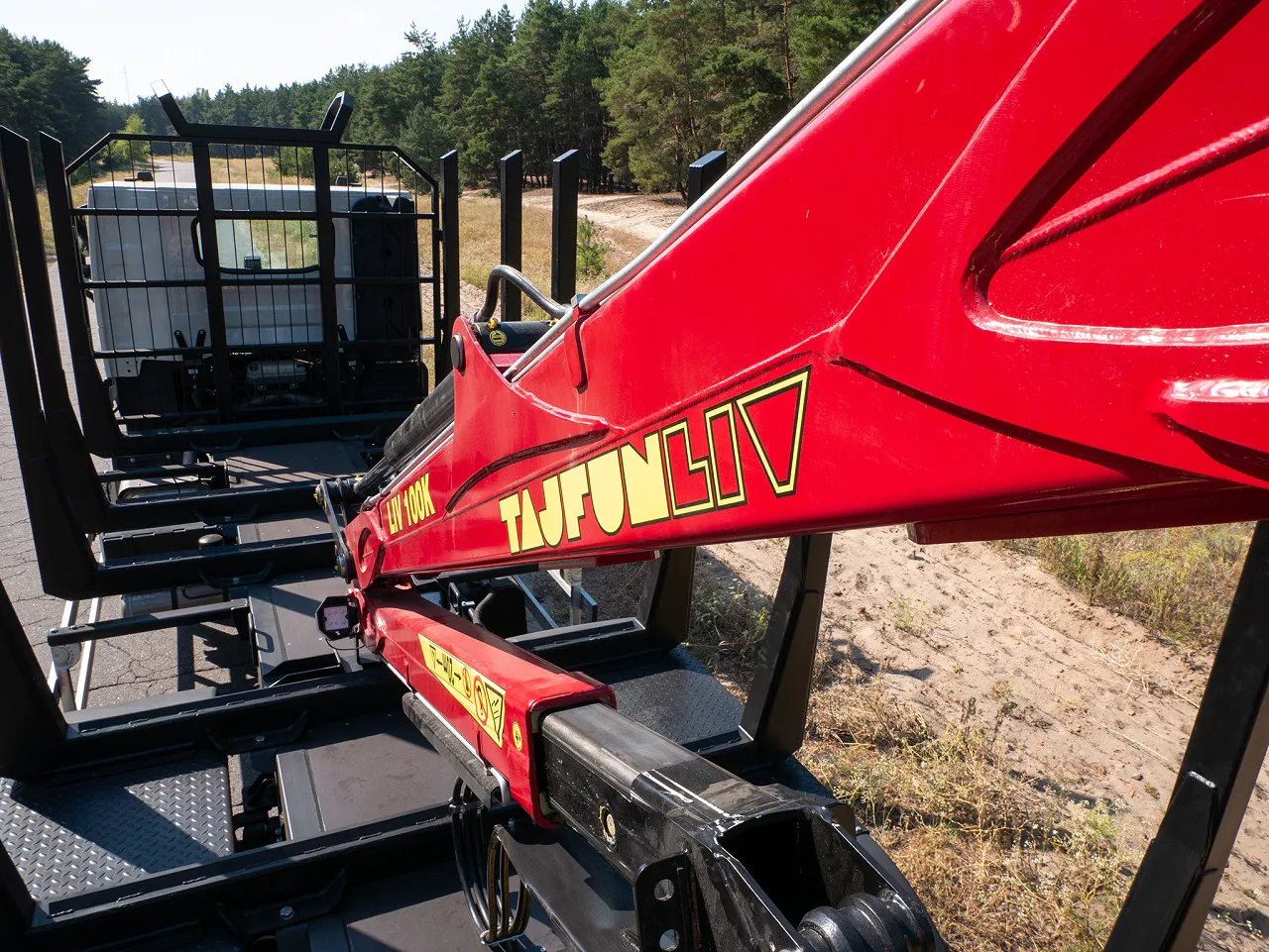 Для погрузки-разгрузки сортиментов установлен мощный кран-манипулятор Tajfun LIV100K (Словения). На максимальном вылете 7922 мм грузоподъемность составляет 1352 кг, а на трехметровом – 2965 кг. Телескопическая стрела может поворачиваться на угол в 425 град. Для повышения устойчивости при работе имеются гидравлические выдвижных опоры (аутригеры).