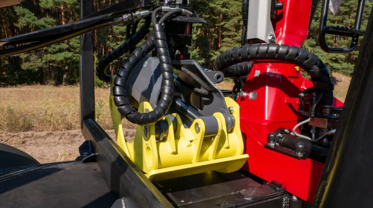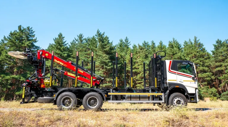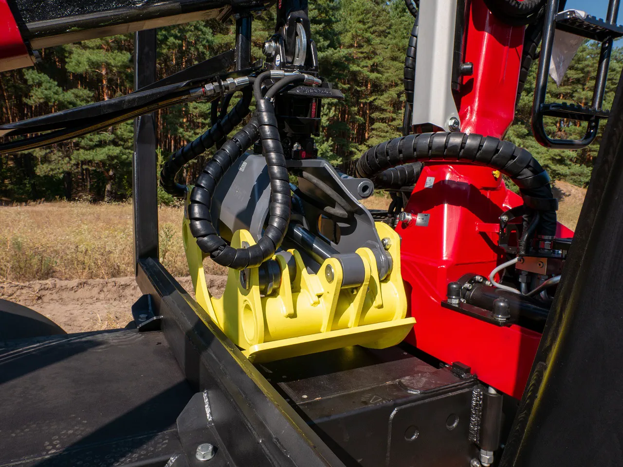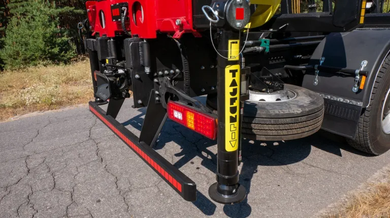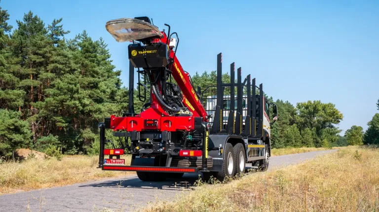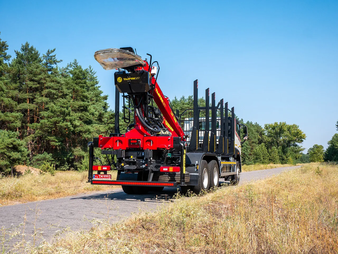 Для погрузки-разгрузки сортиментов установлен мощный кран-манипулятор Tajfun LIV100K (Словения). На максимальном вылете 7922 мм грузоподъемность составляет 1352 кг, а на трехметровом – 2965 кг. Телескопическая стрела может поворачиваться на угол в 425 град. Для повышения устойчивости при работе имеются гидравлические выдвижных опоры (аутригеры).