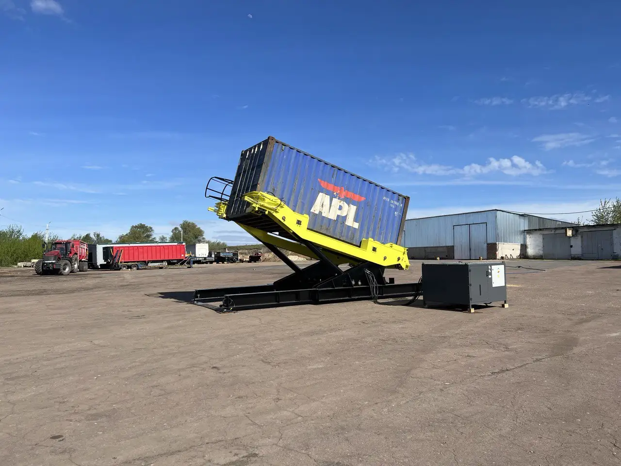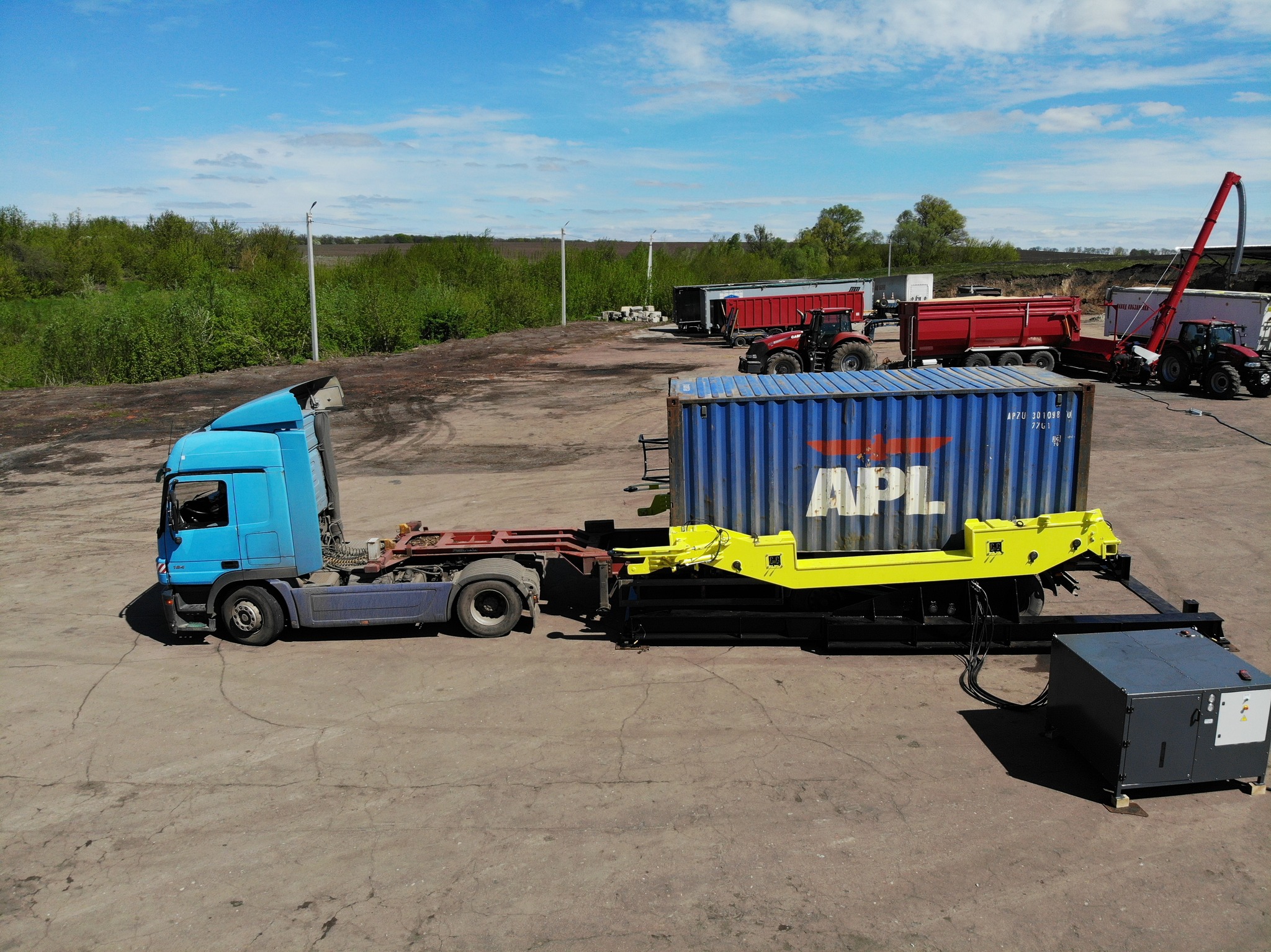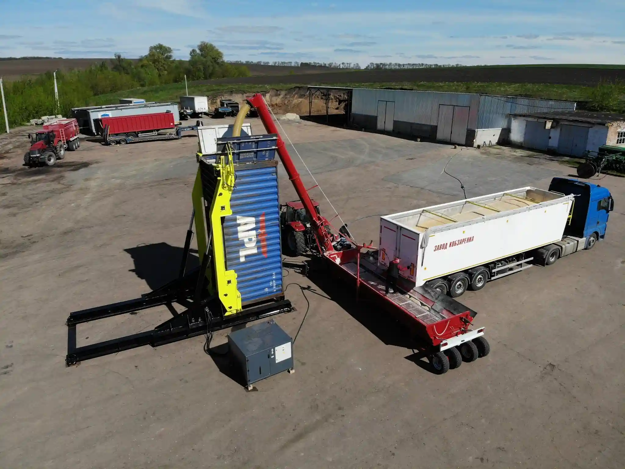 На фото показана работа кантовальщика контейнеров ТОР-20 вместе с наземным перегрузочным бункером БНП-12 «Ковчег» и самосвальным алюминиевым зерновозом АНП-55, также произведенных на предприятии «Завод Кобзаренка».