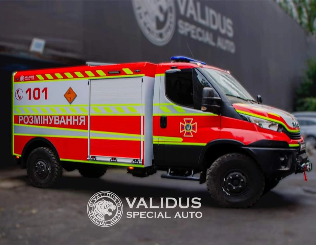 Сегодня перед спасателями стоит непростая задача по разминированию многих тысяч квадратных километров нашей территории, освобожденной от российских оккупантов. А потому резко возросла потребность в специальных пиротехнических автомобилях. На днях Главному управлению ГСЧС был поставлена пиротехническая машина легкого типа ПМ-Л. Она построена отечественной компанией «Валидус Спецавто» на полноприводном шасси IVECO Daily 4х4. Модель отличается увеличенным клиренсом, внедорожными шинами и наличием мощной лебедки на переднем бампере.