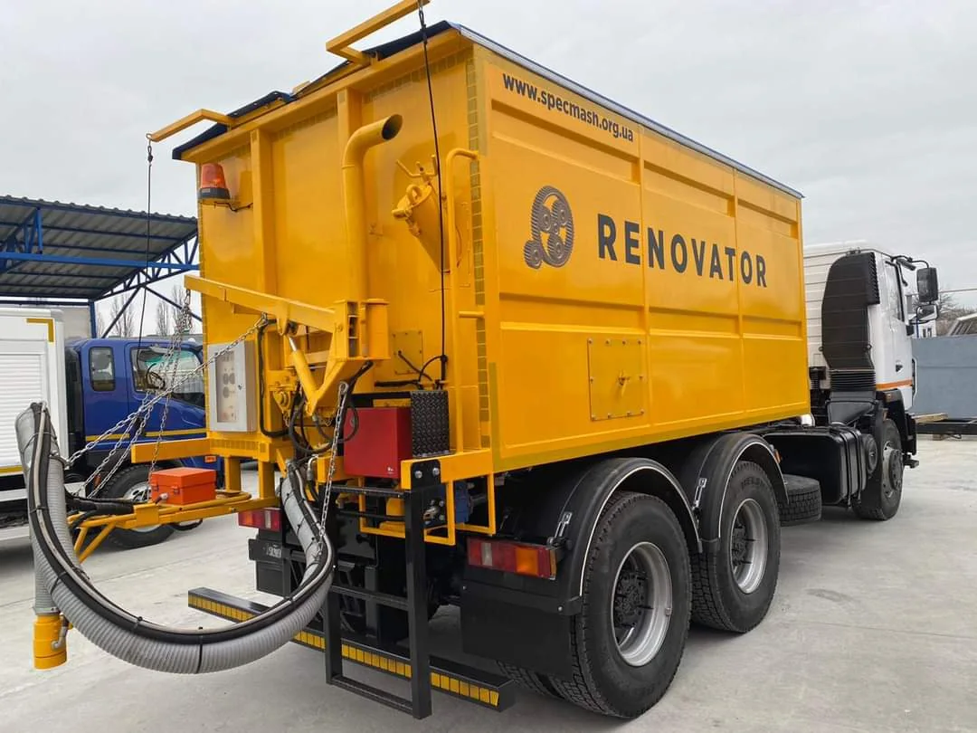 Второй поставленный специализированный автомобиль от «Альфатекс» - дорожная комбинированная машина АТ МДК-9/14 c установкой для ямочного ремонта Renovator 9/2. На шасси 6х4 смонтирован двухсекционный бункер для щебня на 9 м куб., бак для эмульсии емкостью 1600 л.