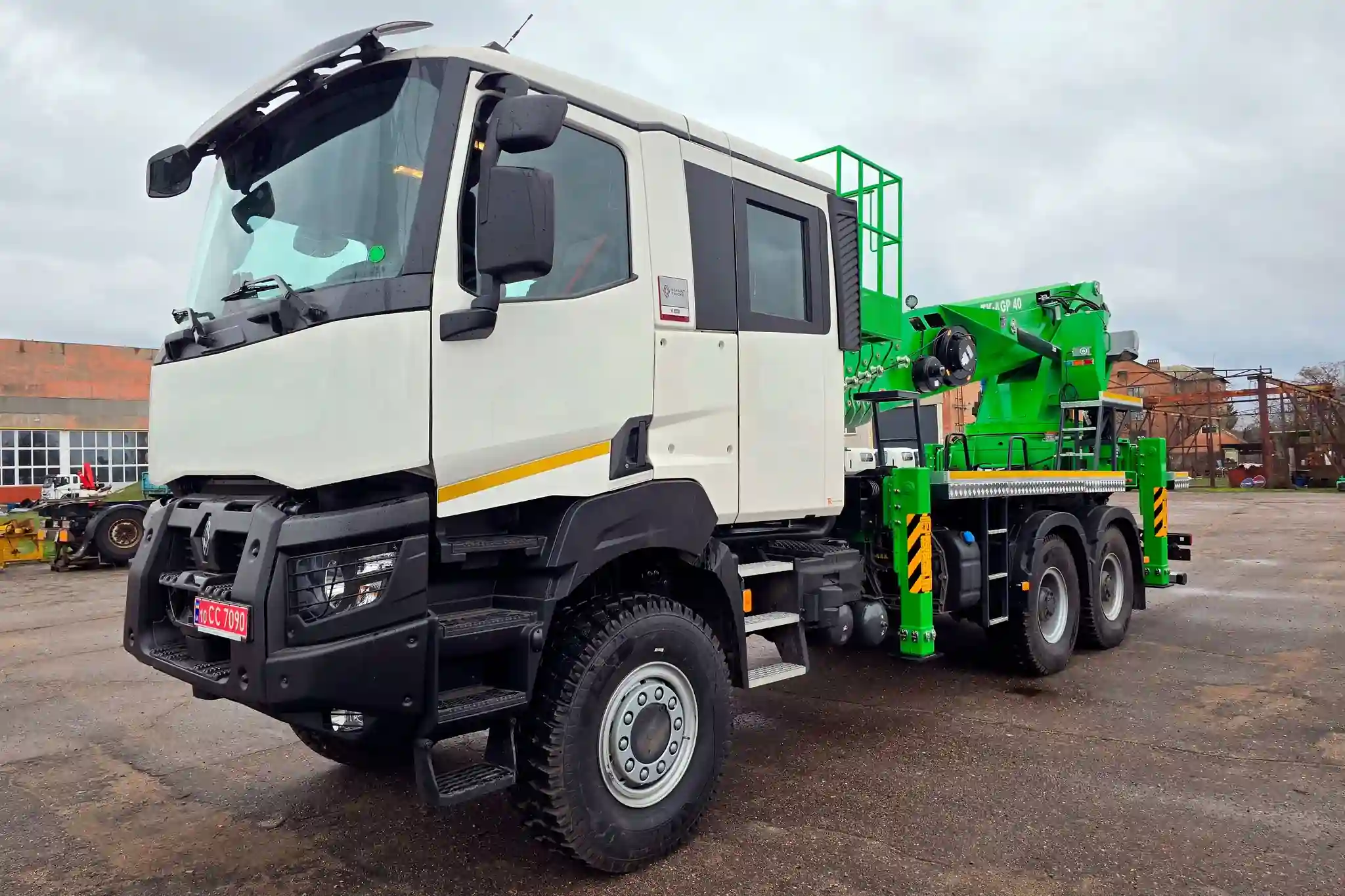 Автовышка Dasan DS400 может устанавливаться на шасси с полной массой 13 т и выше. В данном случае было выбрано большегрузное шасси Renault Trucks cерии К, колесной формулы 6х6. Оно рассчитано на полную массу 31,4 т при собственном весе 11 т и оснащается 13-литровым двигателем мощностью 440 л. с. Кабина применяется двухрядная, что позволяет перевозить ремонтную бригаду. Кстати, применения удлиненной кабины обусловило размещение автовышки в транспортном положении с корзиной спереди и поворотной платофрмой сзади, что оптимизировало габаритные размеры и распределение веса на шасси.