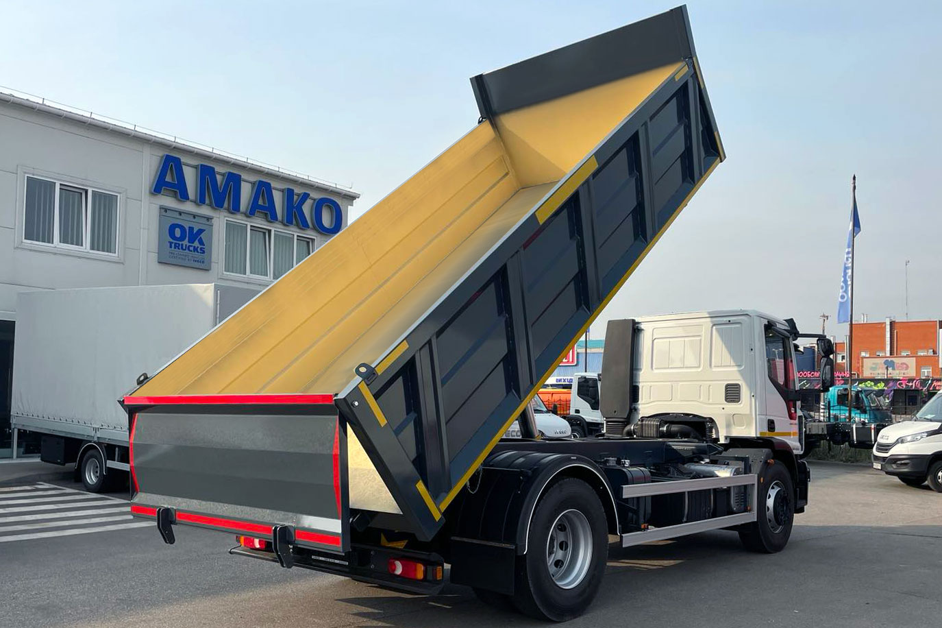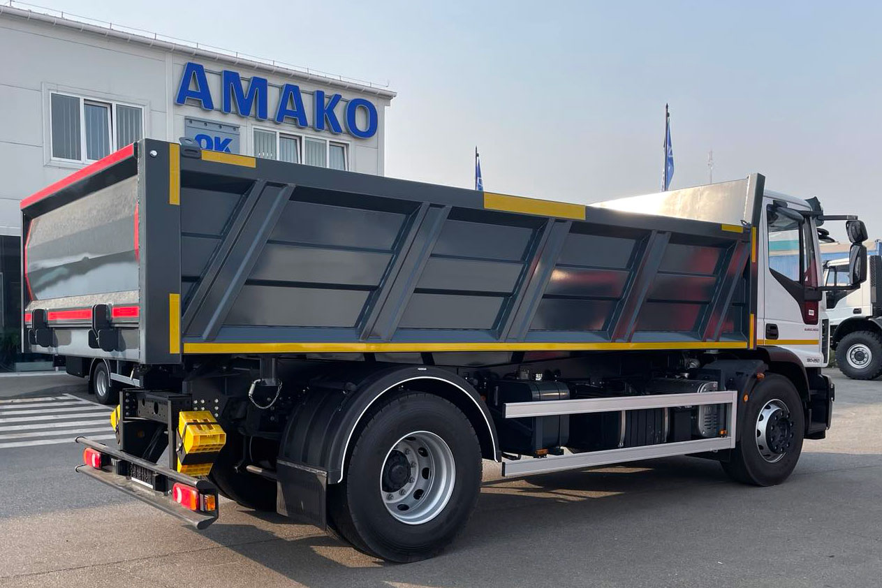 Завод спецтехники «Техкомплект» на днях изготовил для своего партнера – компании АМАКО – самосвал на шасси IVECO Eurocargo ML180E25. Его особенностью является кузов прямоугольной формы, типа ST (Square Type). Такая платформа позволяет перевозить больше груза и при этом обладает низким центром тяжести, что улучшает устойчивость. В данном случае кузов имеет вместимость 11,46 м куб. – при длине 5200 мм, ширине 2450 мм и высоте 900 мм. Платформа задней разгрузки оснащена гидроцилиндром марки HYVA.