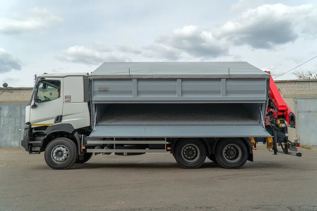 Самосвальная платформа боковой разгрузки (на две стороны) имеет объем 21 м куб и выполнена из стали S355 – c толщиной пола и бортов 5 м и 4 мм соответственно. Грузоподъемность достигает 30 т. Кузов оборудован тентом и откидной, смотровой площадкой на заднем борту. Применяется итальянская гидравлика IPH (Penta).