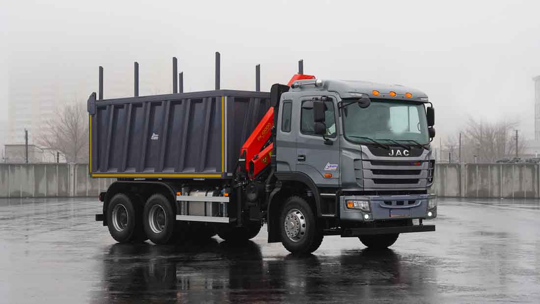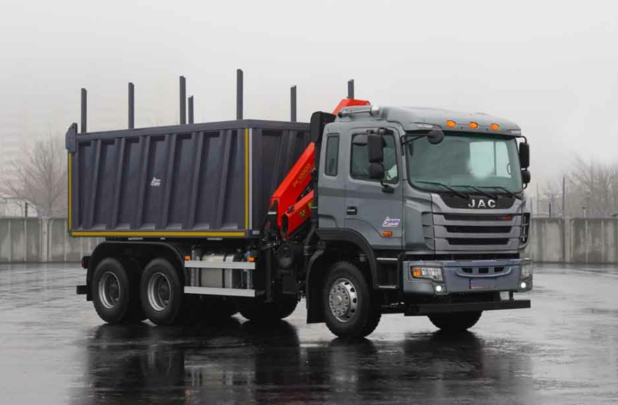 Группа компаний «Будшляхмаш» осуществила первую поставку техники в 2025 году. Заказчику был передан мощный самосвал на шасси JAC N350 (6×4), оснащенный краном-манипулятором и грейферным захватом.