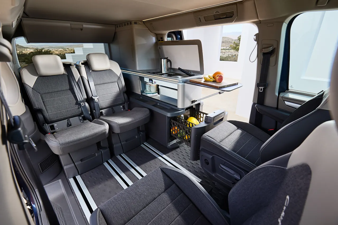 Исполнения Coast и Ocean – 4-местные, с полноценным кухонным блоком слева по борту. Тут уже есть раковина и два дополнительных аккумулятора по 40 Ач. Раскладная кровать имеет размеры 1980 х 1060 мм. Флагманским вариантом считается Ocean. Здесь кресла обиты тканью Melange Raven из переработанных материалов. Имеются подогрев передних сидений, дополнительный воздушный отопитель, Climatronic, фоновое освещение кухонного блока, увеличенный на 5 л (до 28 л) бак для пресной воды, который также устанавливается и в версии Coast.