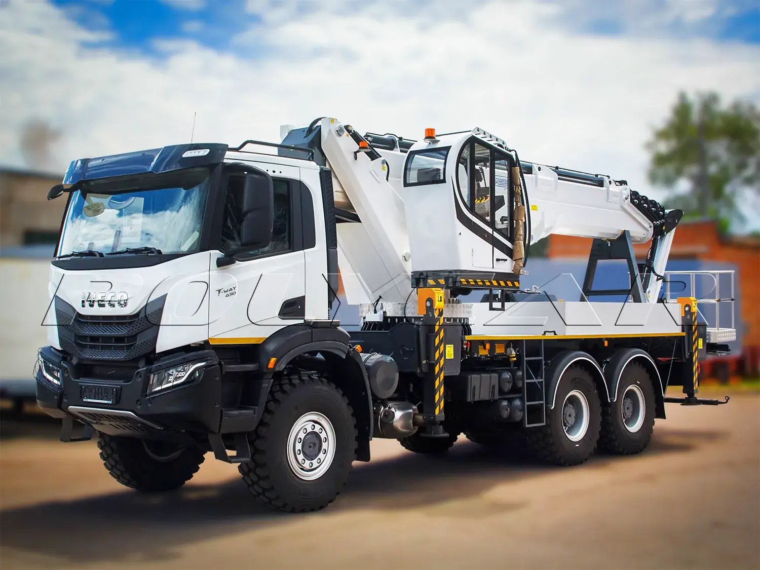 Шасси IVECO T-Way колесной формулы 6х6 имеет дорожный просвет в 310 мм и внедорожные шины, причем сзади односкатные. Полная масса составляет 26 т.