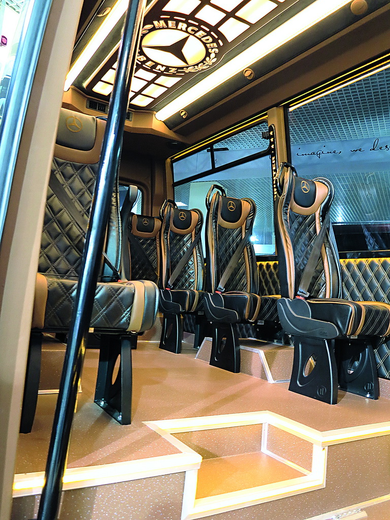 Местная компания Cancan переделывает обычные фургоны, такие как этот Mercedes-Benz Sprinter, в люксовые микроавтобусы. В салоне этой модели особенно впечатляет потолок.