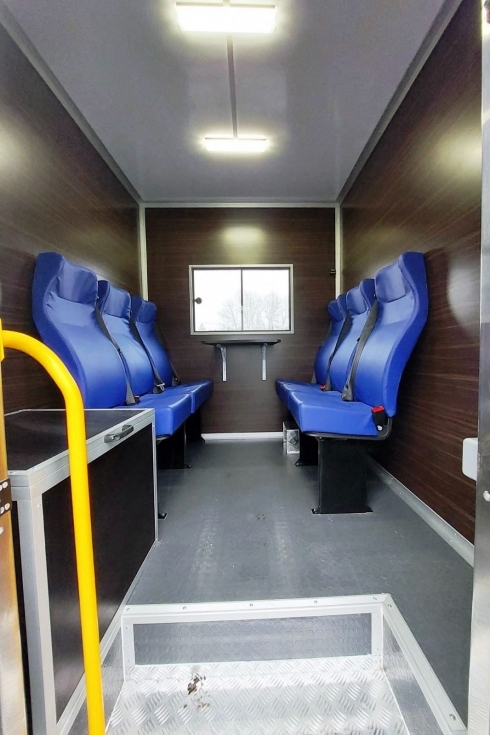 Один из них пассажирский – с сиденьями на шесть человек, автономным обогревателем, вентиляционным люком и переговорным устройством с кабиной водителя.