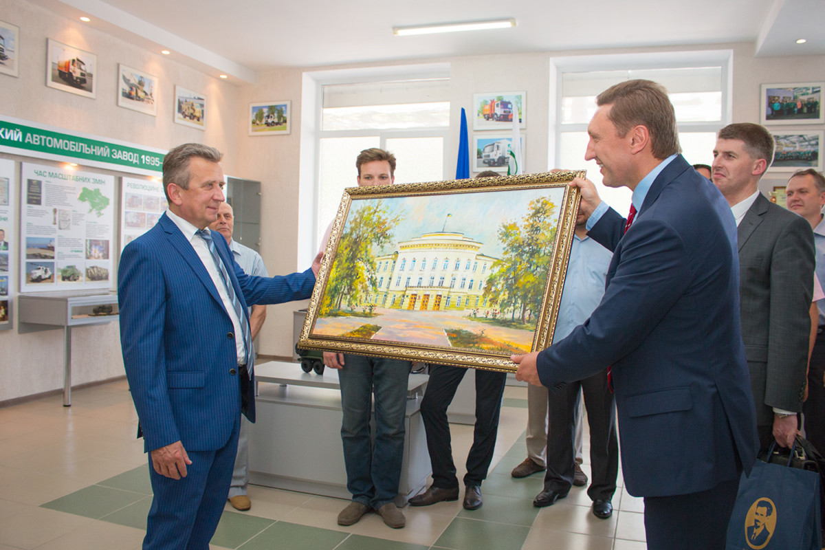 Замечательная картина маслом с изображением главного корпуса ПолтНТУ, которому скоро исполнится 200 лет, нашла свое почетное место среди музейных экспонатов, а в книге отзывов — запись: «От научно-педагогического коллектива Полтавского национального технического университета им. Юрия Кондратюка выражаем искреннюю благодарность за презентацию такой мощной и великой истории становления и развития завода «КрАЗ». Желаем дальнейших достижений и оставаться мировым лидером в машиностроении. С уважением, ректор ПНТИ Владимир Онищенко. 27.06.2017 г.»