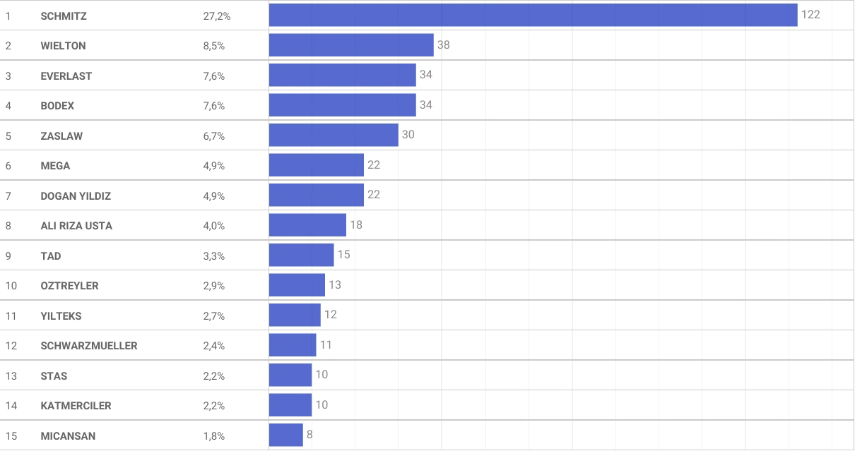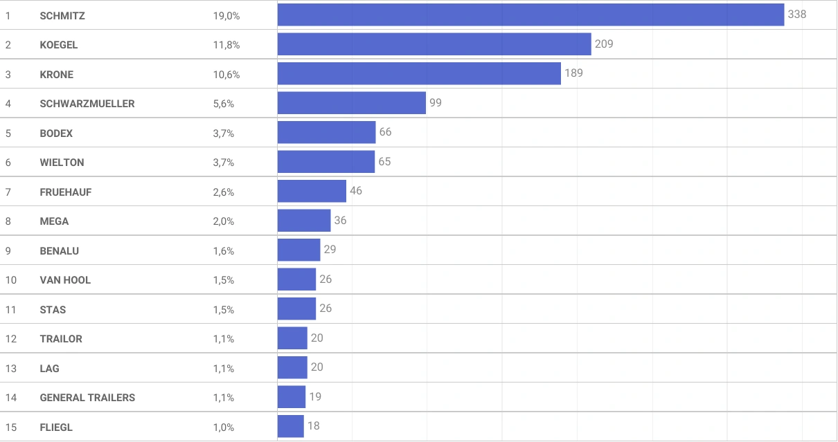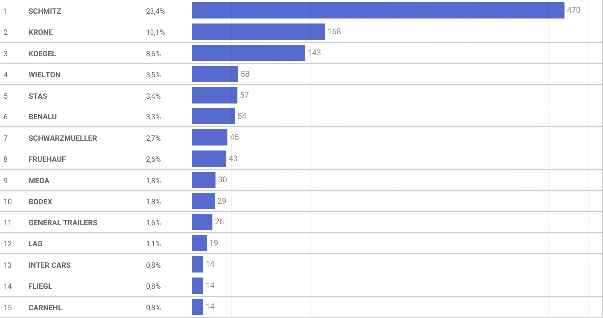 Что же касается наиболее популярных марок, то первое место уверенно держит Schmitz Cargobull, причем во всех трех сегментах: внутренних перепродажах – 19% (338 ед.), подержанном импорте – 28,4% (470 ед.) и новых – 27,2% (122 ед.).