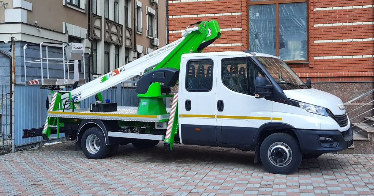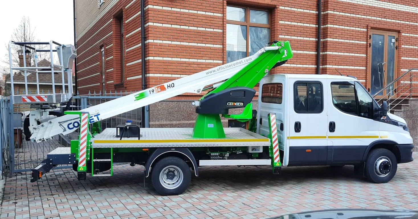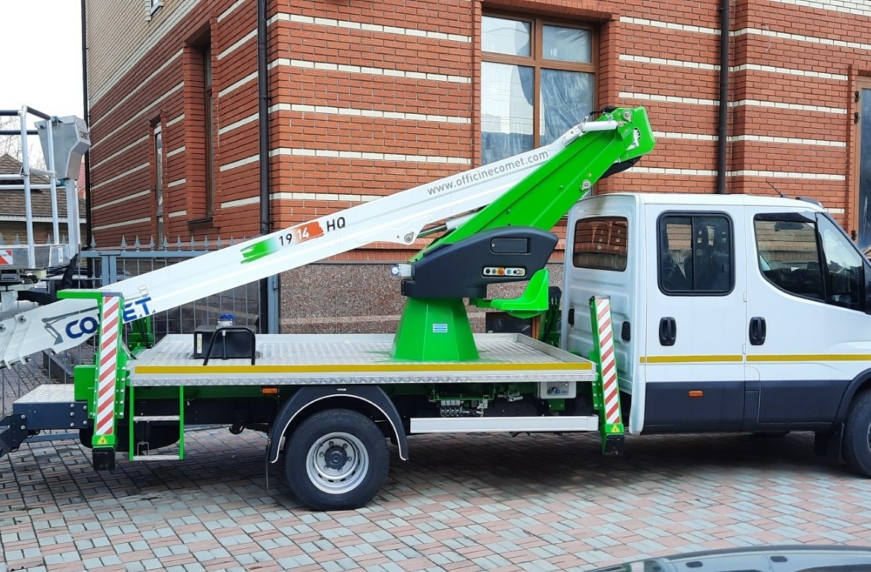 Самой популярной здесь является модель 19-2-14HQ от итальянского производителя Comet. Именно такой автогидроподъемник, установленный на шасси IVECO Daily с двухрядной, 7-местной кабиной и был отправлен на днях в Черниговскую область.