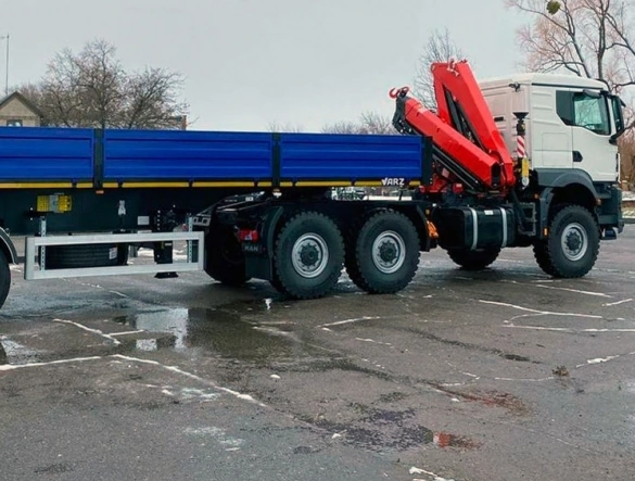 Новинка ТК-TGS-КМ-195 состоит из полноприводного седельного тягача MAN TGS, оборудованного итальянским шарнирным краном-манипулятором, и бортового полуприцепа отечественнго производства – ВАРЗ-НПМ 2311.