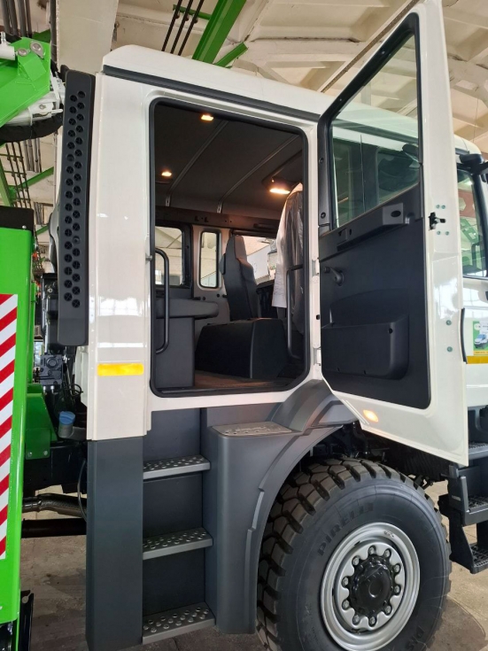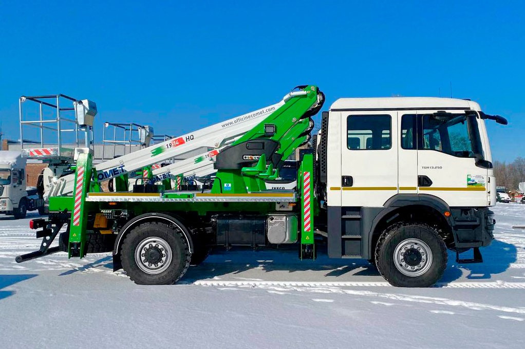 В данном случае для установки Сomet 19-2-14 HQ впервые было использовано полноприводное шасси MAN TGM 13.250 (4×4), которое рассчитано на полную массу 13 т и оснащается 250-сильным турбодизелем. Из интересных деталей отметим наличие экипажной, шестиместной кабины, отлично подходящей для перевозки ремонтной бригады.