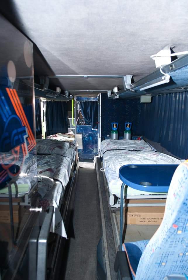 Для перевозки людей привлекли комфортабельные туристические автобусы, переоборудованные силами местных СТО в санитарные. На фотографии показан один из них – двухэтажный Neoplan Skyliner. На первом его этаже установлены лежачие места для больных и маломобильных людей, имеются кислородные баллоны и другое медоборудование.