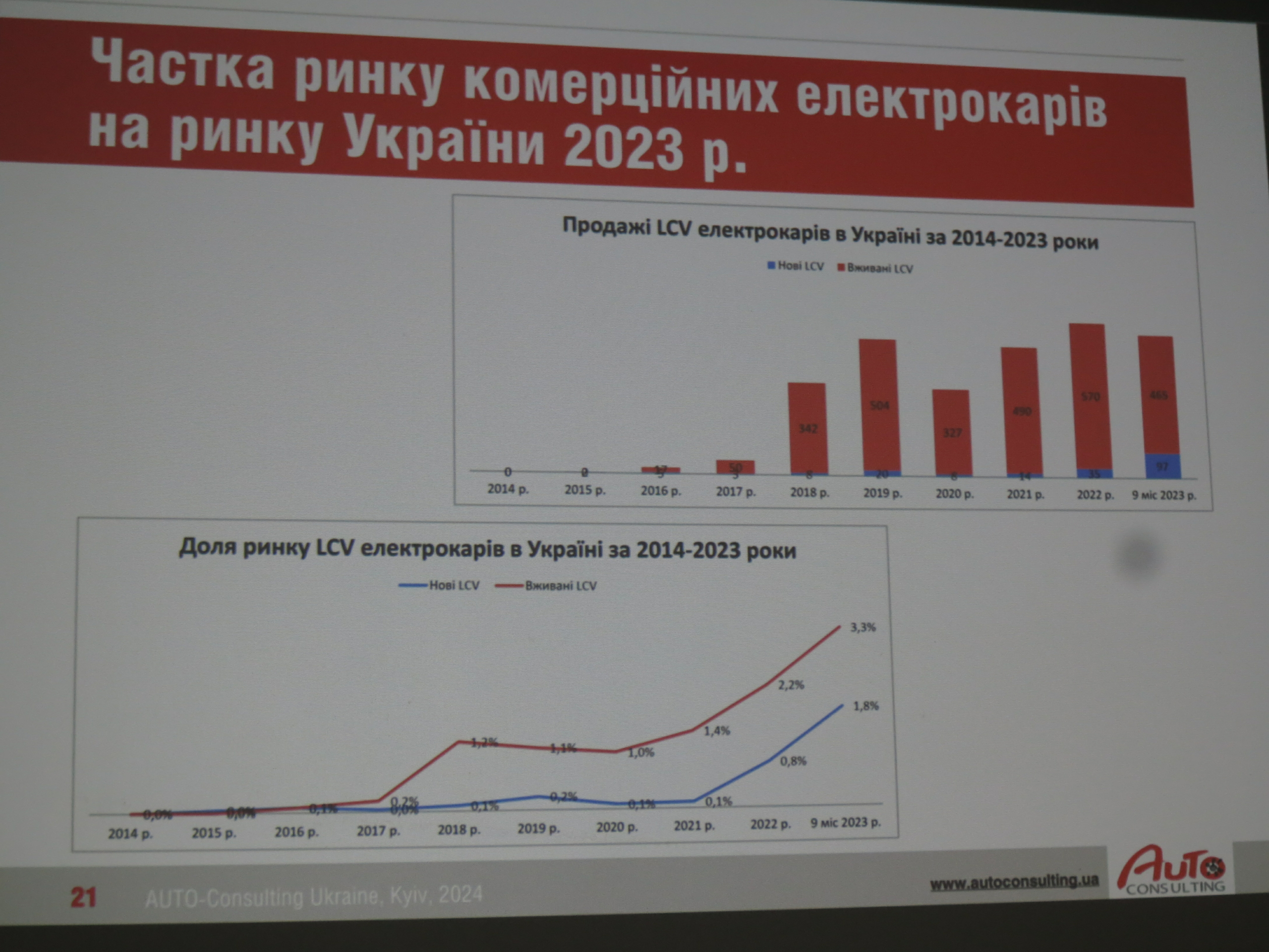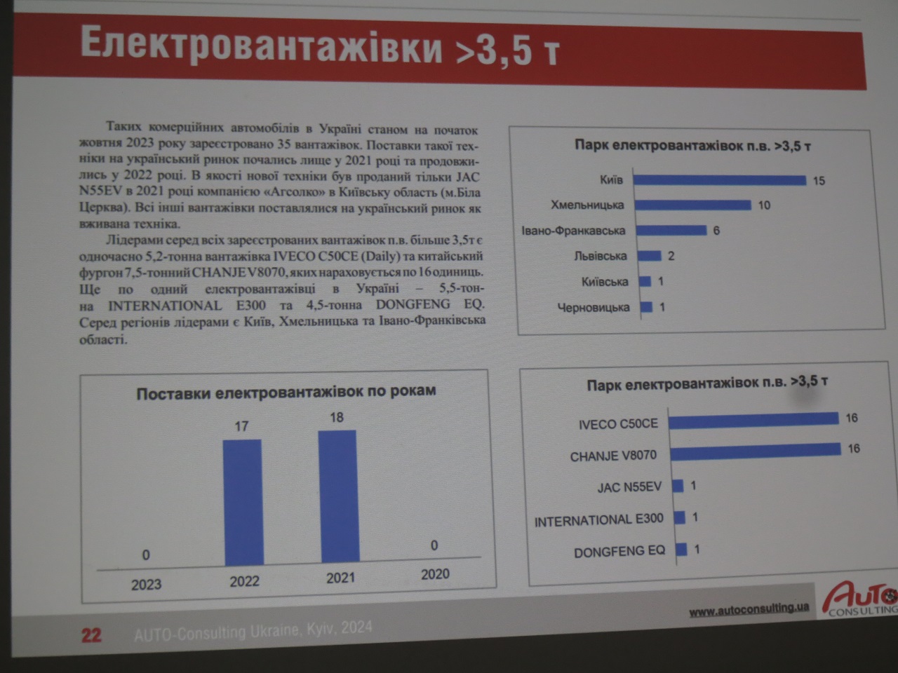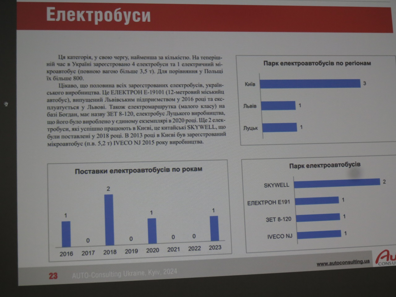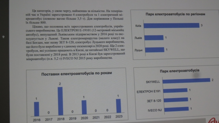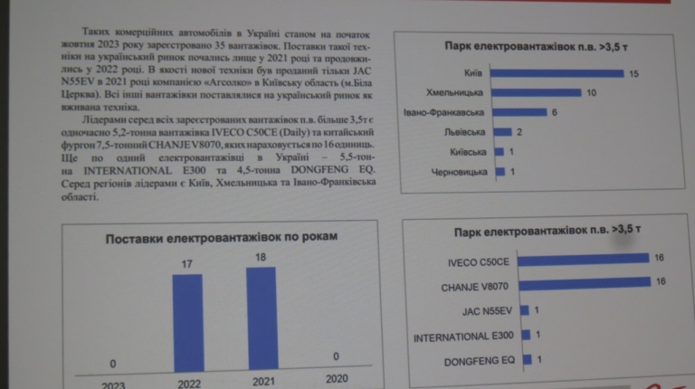 Отдельной темой на конференции стал анализ украинского рынка электромобилей, в том числе и развозных. Первые коммерческие продажи электромобилей в Украине стартовали еще 27 мая 2011 года. С учетом данных за первый квартал 2024 года их число составило 95 744 ед. Из этого количества на легкие развозные электромобили пришлось 3228 ед., на грузовики среднего и тяжелого классов – только 35 ед., а на электробусы – и вовсе всего лишь 5 ед.