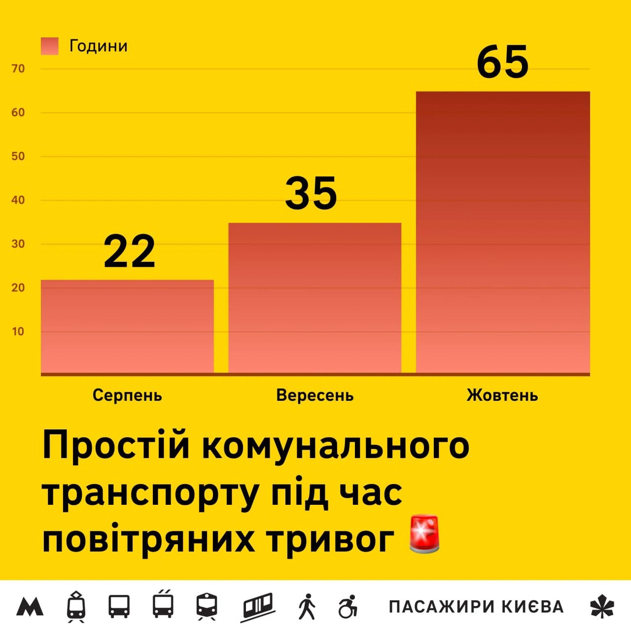 Воздушные тревоги в Киеве за последние три месяца вынудили простаивать пассажирский транспорт 122 часа, что равняется пяти суткам, сообщается на страничке инициативы "Пасажири Києва" в Фейсбук. Плюс к этому нужно добавить десятки затраченных часов на нормализацию движения.