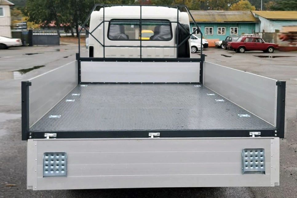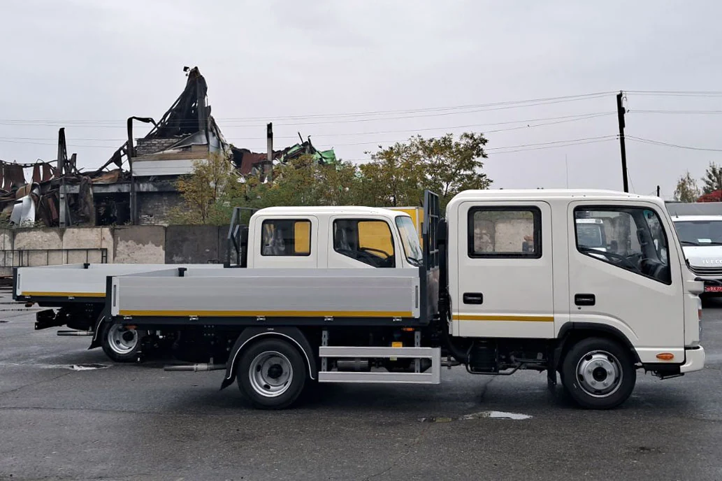 На шасси JAC N56 DC c двухрядной пятиместной кабиной установили вместительную бортовую платформу производства Завода спецтехники «Техкомплект». Кузов с внутренними размерами 3200 х 1800 х 400 мм оснащен алюминиевыми бортами и отличается усиленной конструкцией. В полу расположены петли под крепежные ремни. Задний откидной борт имеет удобные подножки, облегчающие доступ в кузов.