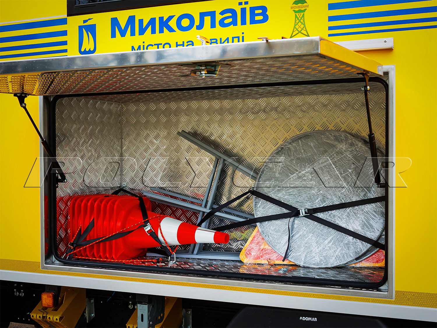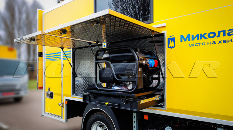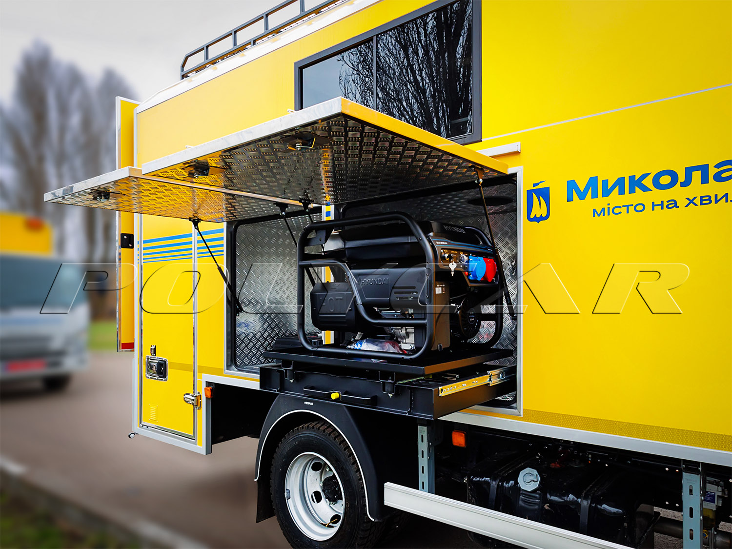Здесь есть верстак с тисками, стеллажи для инструмента. По бортам находятся емкие отсеки. Два из них симметричные, слева и справа, для перевозки одного пропанового и двух кислородных баллонов – все машины оснащены сварочными агрегатами. Еще два отсека предназначены для дизельного генератора, а также дорожных знаков, ограждений и мелкого инструмента.