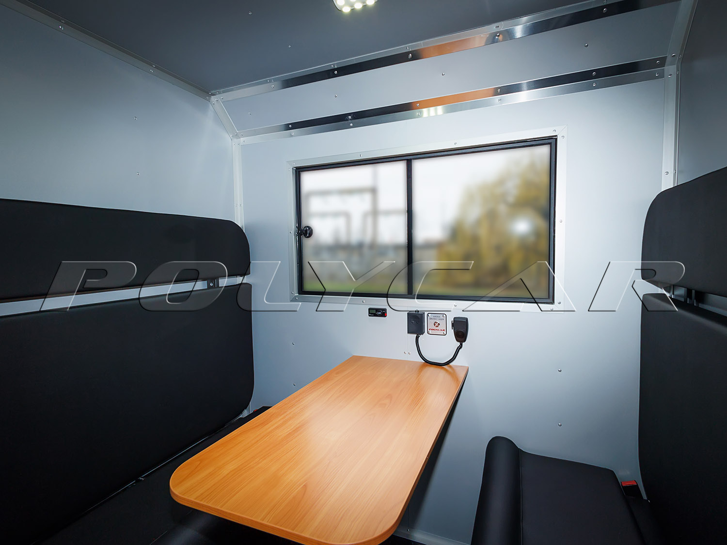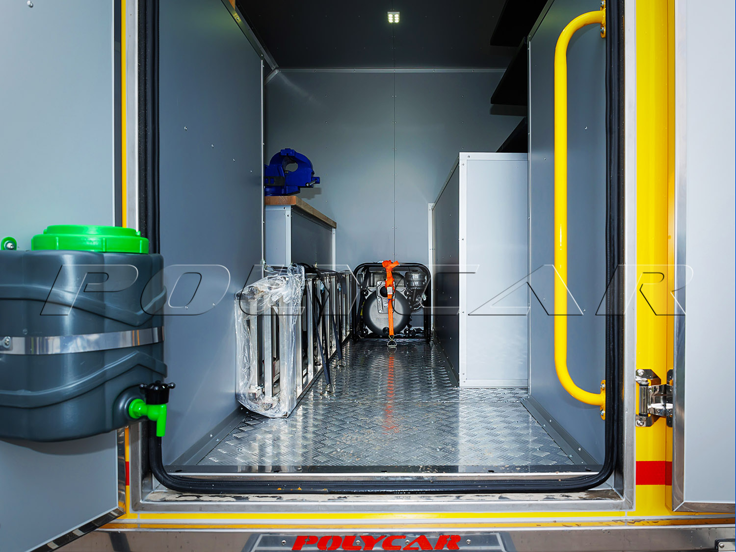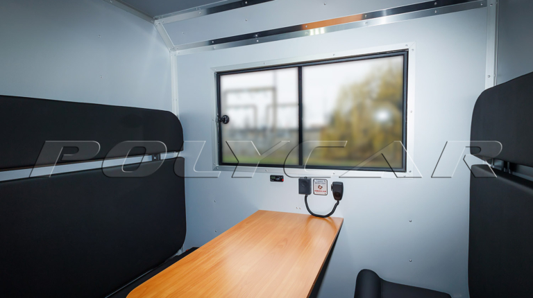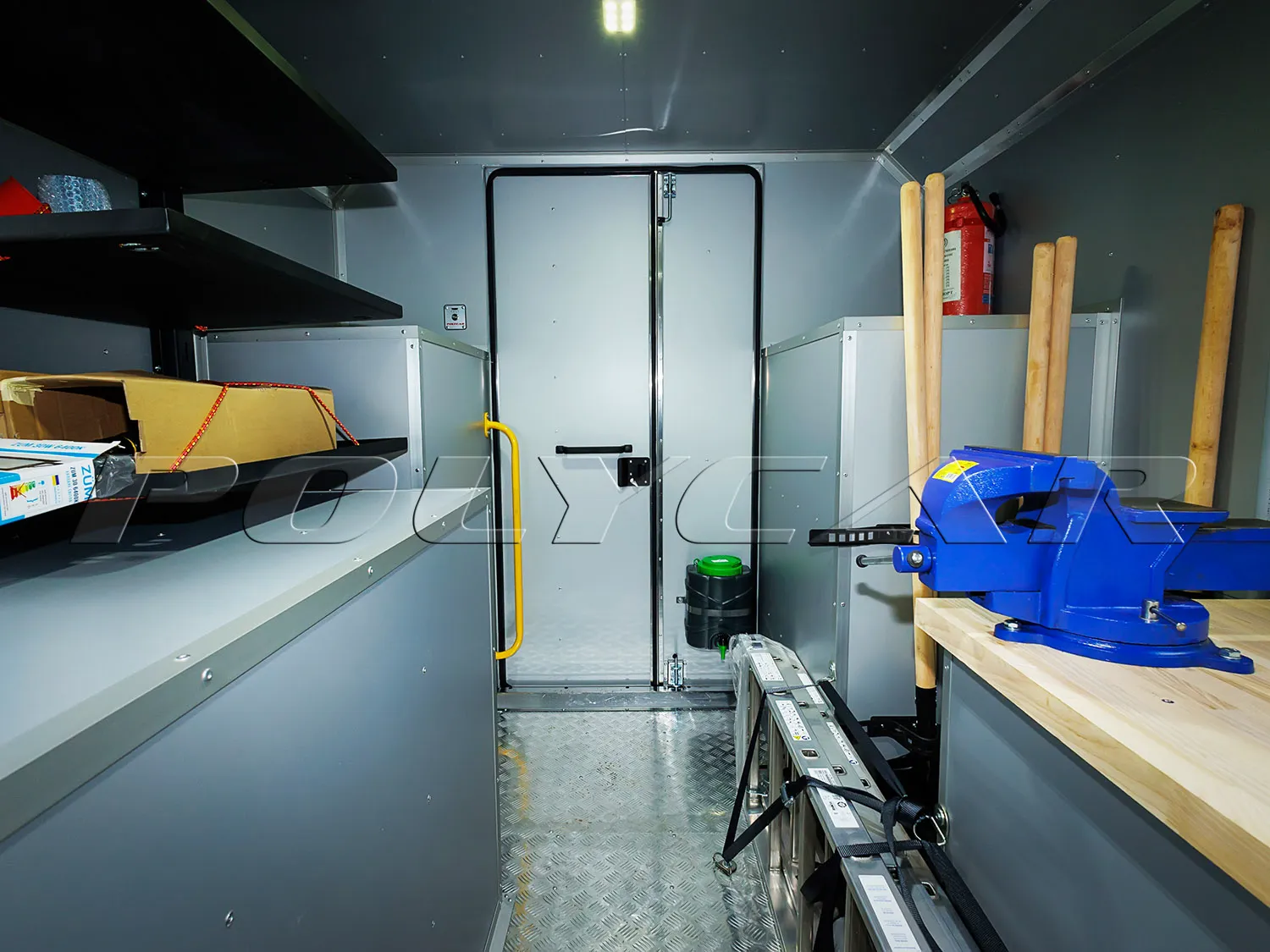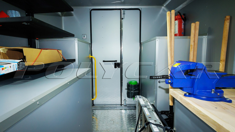 Второй отсек, технологический, приспособлен для размещения необходимого оборудования. Изнутри он обшит влагостойкими алюкомпозитными панелями, на полу – резиновое покрытие.