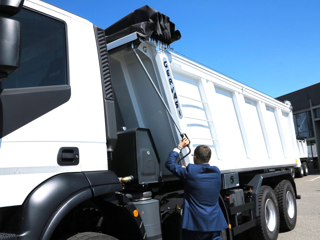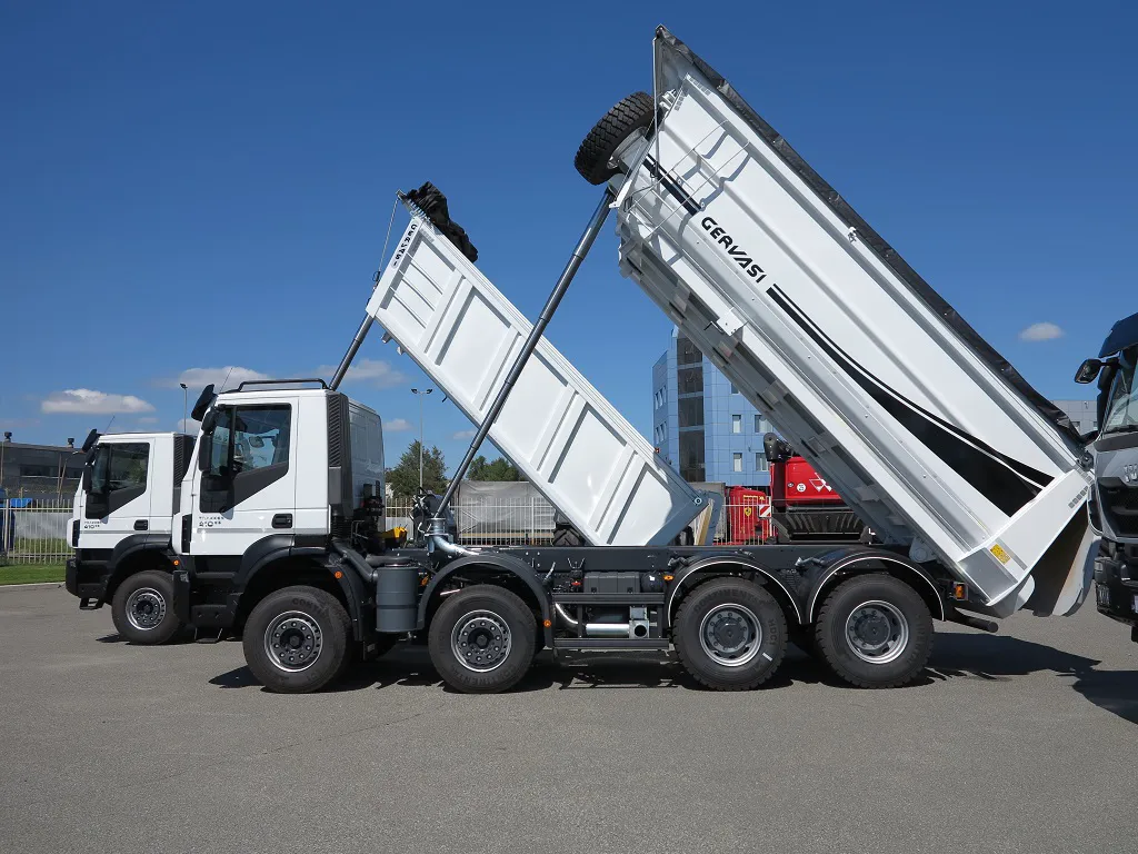 Поставленные в Украину самосвалы IVECO Trakker AD410T41 (8х4) оснащены кузовами известной итальянской фирмы Gervasi. Они выполнены из знаменитой особо износостойкой стали Hardox. Толщина днища кузова – 8 мм, бортов – 5 мм.