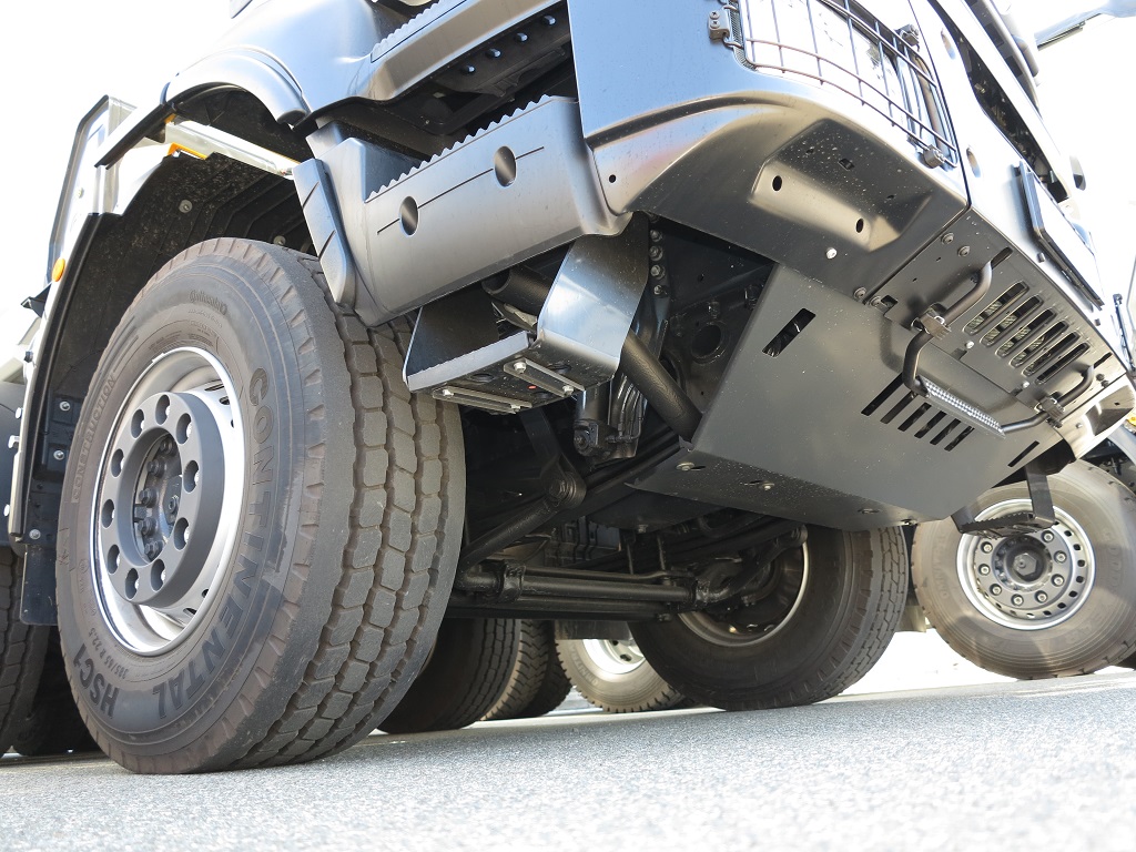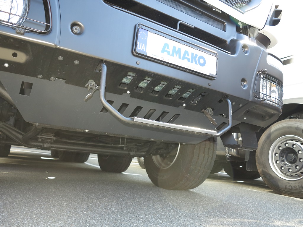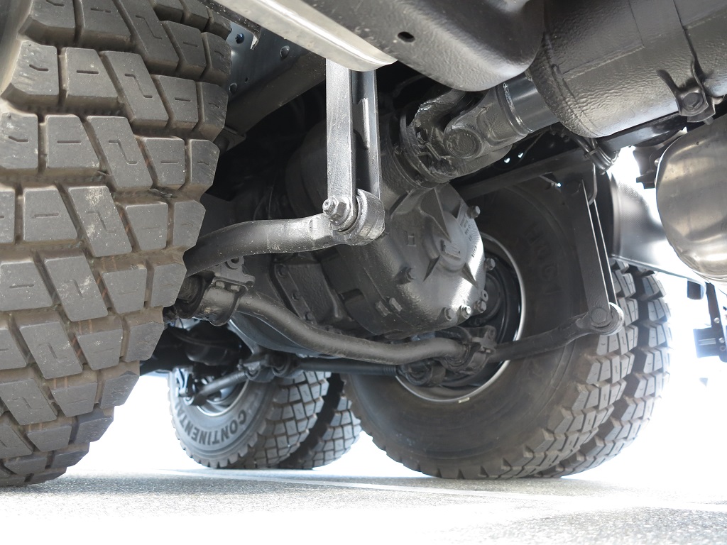 Подвеска передних осей машины усиленная, на параболических рессорах. В частности, имеет три листа вместо двух. Усилена и рама – толщина ее лонжеронов 10 мм. Она имеет лучшее в классе сопротивление кручению. Более крепкие и мосты. Задние мосты усиленные и рассчитаны на суммарную нагрузку 32 т. На двух передних мостах установлены более широкие шины – размерности 385/65 вместо 315/65. Благодаря этому передние колеса в полной мере выдерживают осевую нагрузку до 9 т. Дорожный просвет с этими шинами вполне достаточен – 330 мм.