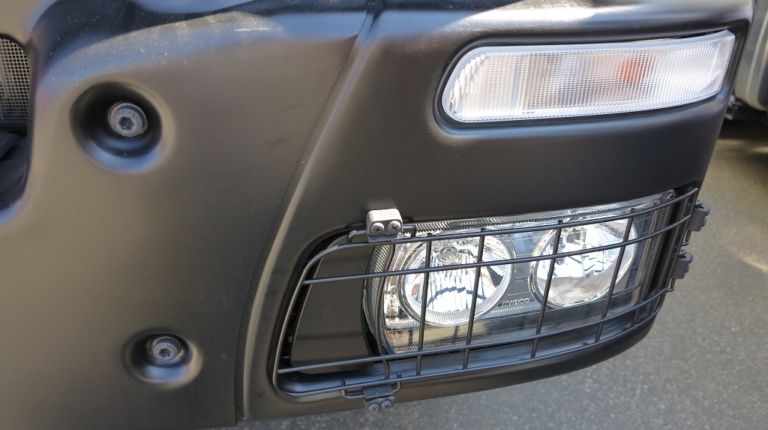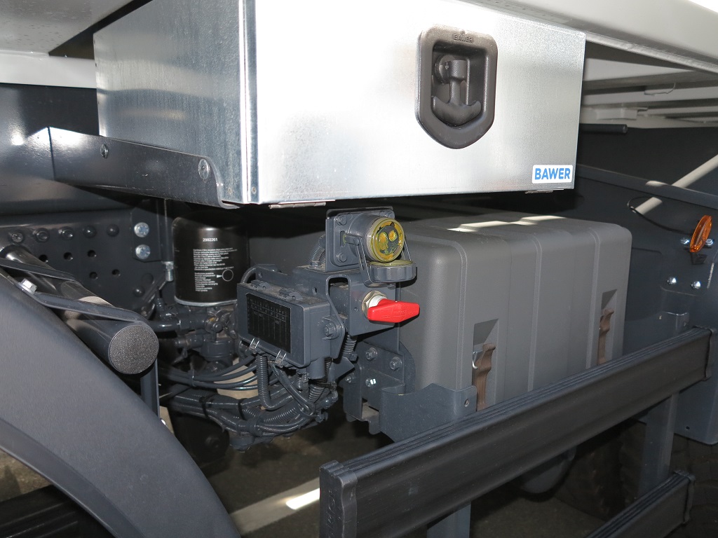 Как и положено строительному самосвалу имеется защита картера. Бампер – прочный металлический. Топливный бак – алюминиевый, на 290 л. Возле него удобно расположен фильтр-сепаратор с подогревом, защищенный стальной пластиной, с удобной подкачкой. Имеется датчик воды, в случае чего ее можно легко спускать из колбы. Для зарядки аккумулятора имеется удобный разъем.