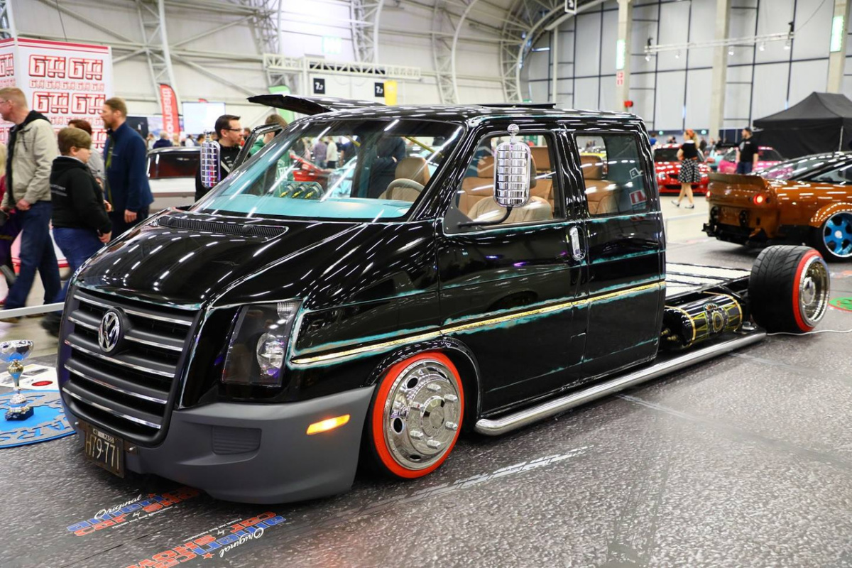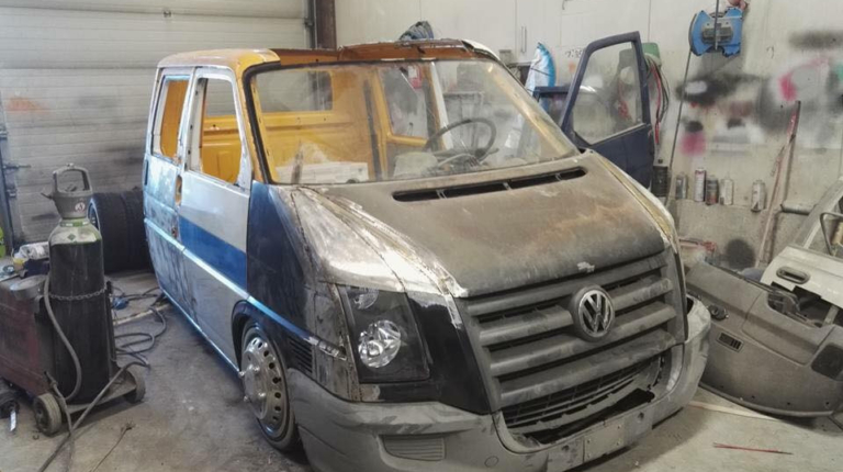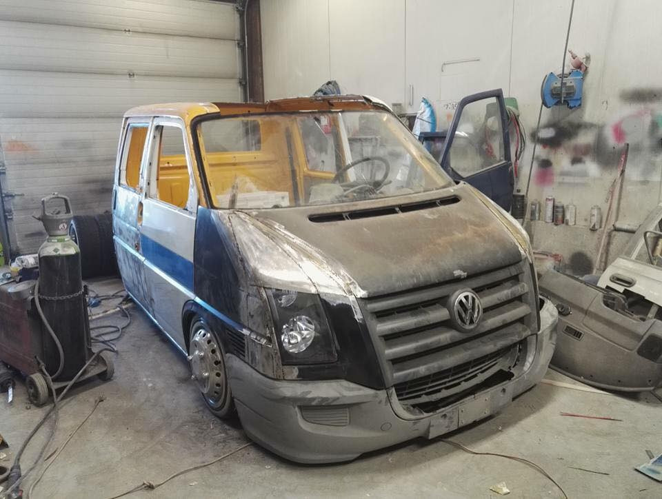 А вот, что с этим автомобилем произошло дальше, можно только подивиться, если посмотреть на фото. Носовая часть, включая решетку радиатора, фары, капот и бампер, были демонтированы. А на их место водрузили кузовные элементы от старшего брата Transporter – фургона Volkswagen Crafter. Интересно, что передние крылья оставили «транспортеровские», только немного их видоизменили.