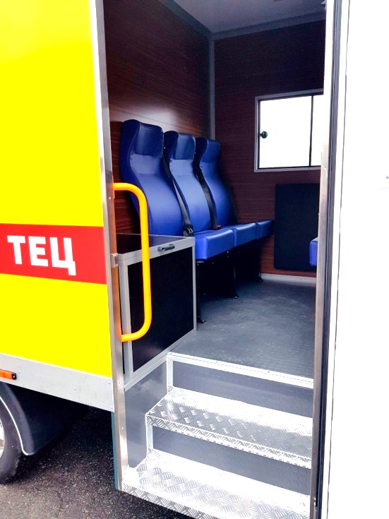 Кузов-фургон аварийно-ремонтной мастерской разделен на два отсека. Первый, пассажирский предназначен для перевозки ремонтной бригады. Он оборудован шестью комфортабельными сиденьями с ремнями безопасности, автономным отопителем Webasto, вентиляционным люком в крыше, а также переговорным устройством с кабиной водителя. Внутренняя обшивка выполнена из алюкомпозитных панелей, которые окрашены «под дерево» для большего уюта.