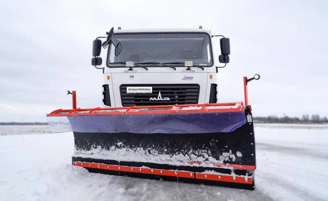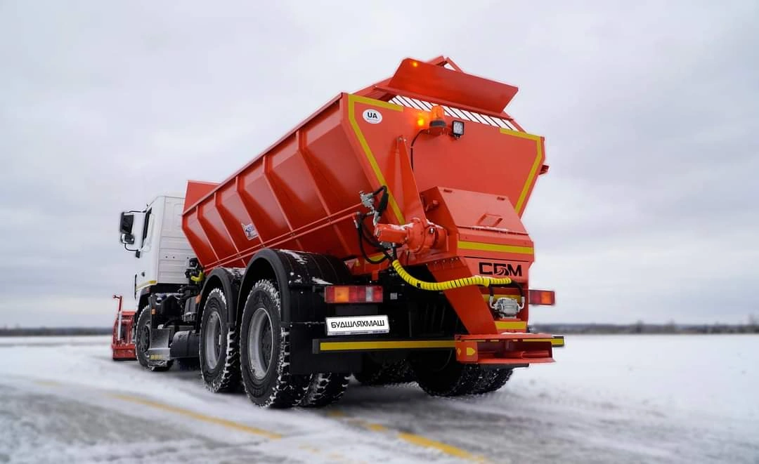Это модель МДКЗ-16, изготовленная отечественной компанией «Будшляхмаш». В основе машин лежит трехосное шасси МАЗ-6312 колесной формулы 6х4. Как видно на фото, сейчас на нем установлен 9,0-кубовый бункер с пескоразбрасывателем, обеспечивающим ширину рабочей зоны от 3 до 12 м, плотность посыпки при этом может варьироваться от 0,01 до 0,4 кг на м кв. А с помощью отвала можно убирать снег, прокладывая "коридор" в 2,7 - 3,0 м.